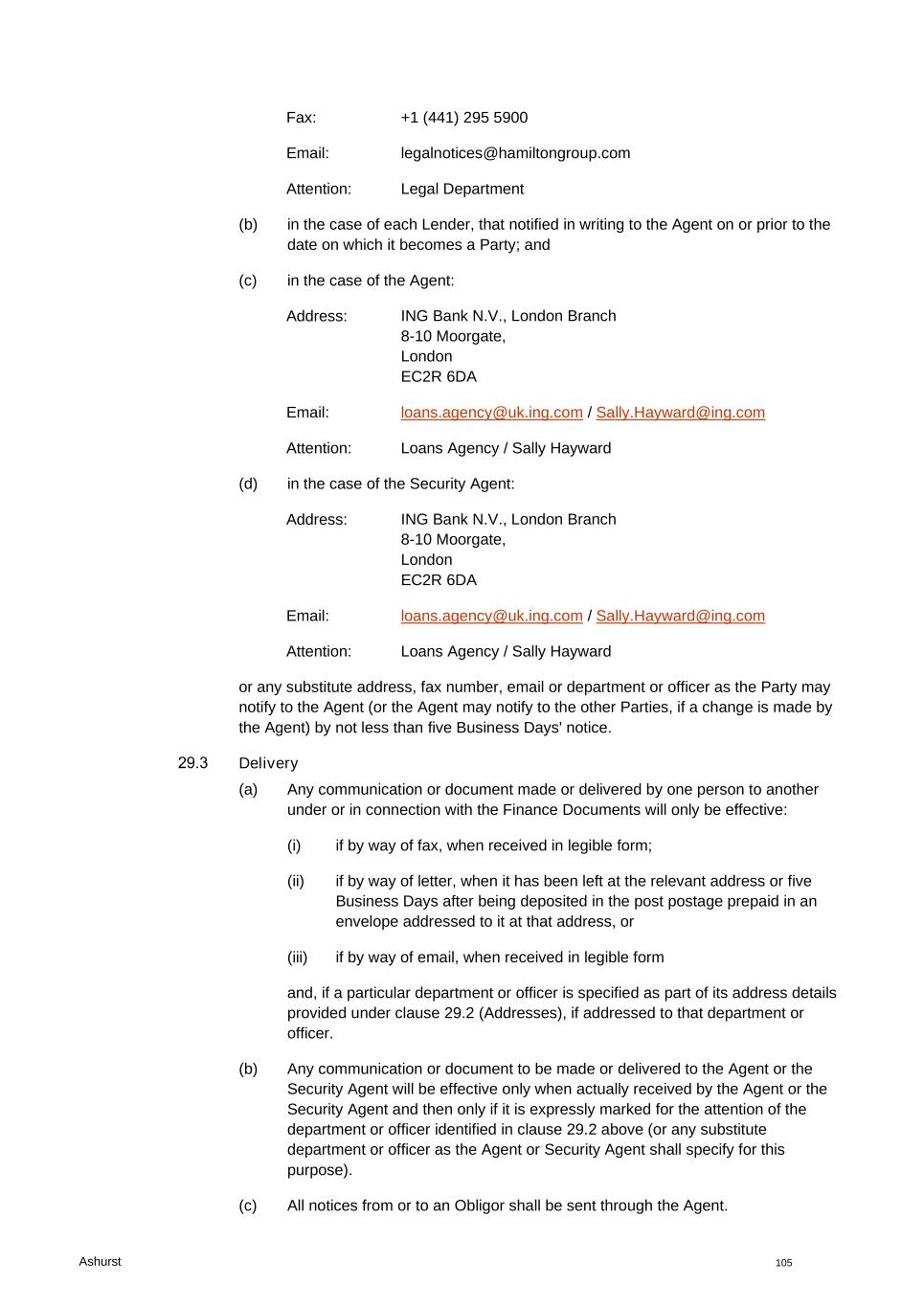 Ashurst 105 Fax: +1 (441) 295 5900 Email: legalnotices@hamiltongroup.com Attention: Legal Department (b) in the case of each Lender, that notified in writing to the Agent on or prior to the date on which it becomes a Party; and (c) in the case of the Agent: Address: ING Bank N.V., London Branch 8-10 Moorgate, London EC2R 6DA Email: loans.agency@uk.ing.com / Sally.Hayward@ing.com Attention: Loans Agency / Sally Hayward (d) in the case of the Security Agent: Address: ING Bank N.V., London Branch 8-10 Moorgate, London EC2R 6DA Email: loans.agency@uk.ing.com / Sally.Hayward@ing.com Attention: Loans Agency / Sally Hayward or any substitute address, fax number, email or department or officer as the Party may notify to the Agent (or the Agent may notify to the other Parties, if a change is made by the Agent) by not less than five Business Days' notice. Delivery (a) Any communication or document made or delivered by one person to another under or in connection with the Finance Documents will only be effective: (i) if by way of fax, when received in legible form; (ii) if by way of letter, when it has been left at the relevant address or five Business Days after being deposited in the post postage prepaid in an envelope addressed to it at that address, or (iii) if by way of email, when received in legible form and, if a particular department or officer is specified as part of its address details provided under clause 29.2 (Addresses), if addressed to that department or officer. (b) Any communication or document to be made or delivered to the Agent or the Security Agent will be effective only when actually received by the Agent or the Security Agent and then only if it is expressly marked for the attention of the department or officer identified in clause 29.2 above (or any substitute department or officer as the Agent or Security Agent shall specify for this purpose). (c) All notices from or to an Obligor shall be sent through the Agent.