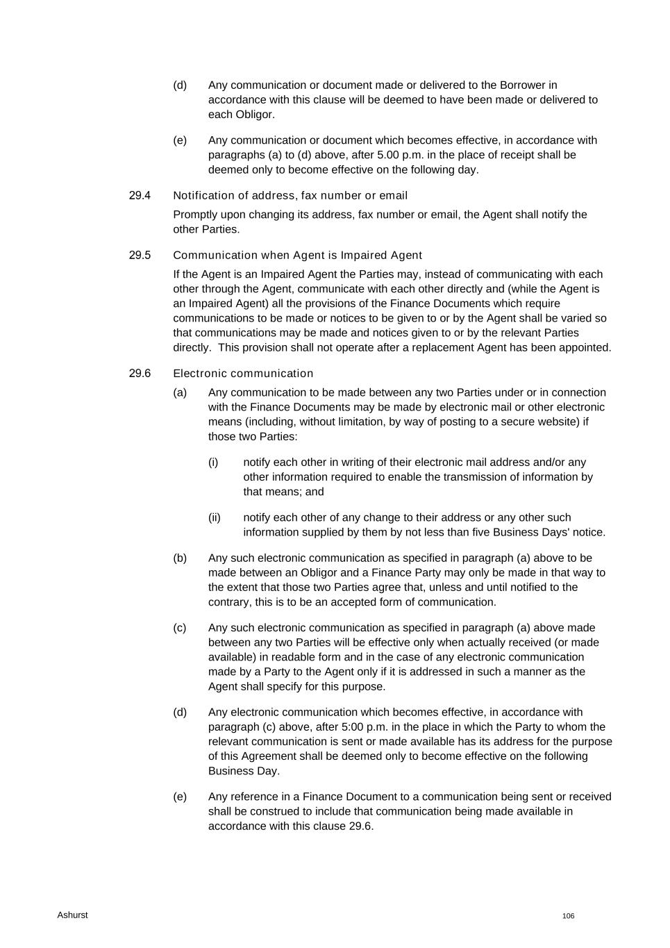 Ashurst 106 (d) Any communication or document made or delivered to the Borrower in accordance with this clause will be deemed to have been made or delivered to each Obligor. (e) Any communication or document which becomes effective, in accordance with paragraphs (a) to (d) above, after 5.00 p.m. in the place of receipt shall be deemed only to become effective on the following day. Notification of address, fax number or email Promptly upon changing its address, fax number or email, the Agent shall notify the other Parties. Communication when Agent is Impaired Agent If the Agent is an Impaired Agent the Parties may, instead of communicating with each other through the Agent, communicate with each other directly and (while the Agent is an Impaired Agent) all the provisions of the Finance Documents which require communications to be made or notices to be given to or by the Agent shall be varied so that communications may be made and notices given to or by the relevant Parties directly. This provision shall not operate after a replacement Agent has been appointed. Electronic communication (a) Any communication to be made between any two Parties under or in connection with the Finance Documents may be made by electronic mail or other electronic means (including, without limitation, by way of posting to a secure website) if those two Parties: (i) notify each other in writing of their electronic mail address and/or any other information required to enable the transmission of information by that means; and (ii) notify each other of any change to their address or any other such information supplied by them by not less than five Business Days' notice. (b) Any such electronic communication as specified in paragraph (a) above to be made between an Obligor and a Finance Party may only be made in that way to the extent that those two Parties agree that, unless and until notified to the contrary, this is to be an accepted form of communication. (c) Any such electronic communication as specified in paragraph (a) above made between any two Parties will be effective only when actually received (or made available) in readable form and in the case of any electronic communication made by a Party to the Agent only if it is addressed in such a manner as the Agent shall specify for this purpose. (d) Any electronic communication which becomes effective, in accordance with paragraph (c) above, after 5:00 p.m. in the place in which the Party to whom the relevant communication is sent or made available has its address for the purpose of this Agreement shall be deemed only to become effective on the following Business Day. (e) Any reference in a Finance Document to a communication being sent or received shall be construed to include that communication being made available in accordance with this clause 29.6.