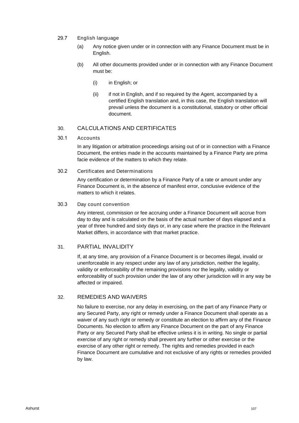 Ashurst 107 English language (a) Any notice given under or in connection with any Finance Document must be in English. (b) All other documents provided under or in connection with any Finance Document must be: (i) in English; or (ii) if not in English, and if so required by the Agent, accompanied by a certified English translation and, in this case, the English translation will prevail unless the document is a constitutional, statutory or other official document. 30. CALCULATIONS AND CERTIFICATES Accounts In any litigation or arbitration proceedings arising out of or in connection with a Finance Document, the entries made in the accounts maintained by a Finance Party are prima facie evidence of the matters to which they relate. Certificates and Determinations Any certification or determination by a Finance Party of a rate or amount under any Finance Document is, in the absence of manifest error, conclusive evidence of the matters to which it relates. Day count convention Any interest, commission or fee accruing under a Finance Document will accrue from day to day and is calculated on the basis of the actual number of days elapsed and a year of three hundred and sixty days or, in any case where the practice in the Relevant Market differs, in accordance with that market practice. 31. PARTIAL INVALIDITY If, at any time, any provision of a Finance Document is or becomes illegal, invalid or unenforceable in any respect under any law of any jurisdiction, neither the legality, validity or enforceability of the remaining provisions nor the legality, validity or enforceability of such provision under the law of any other jurisdiction will in any way be affected or impaired. 32. REMEDIES AND WAIVERS No failure to exercise, nor any delay in exercising, on the part of any Finance Party or any Secured Party, any right or remedy under a Finance Document shall operate as a waiver of any such right or remedy or constitute an election to affirm any of the Finance Documents. No election to affirm any Finance Document on the part of any Finance Party or any Secured Party shall be effective unless it is in writing. No single or partial exercise of any right or remedy shall prevent any further or other exercise or the exercise of any other right or remedy. The rights and remedies provided in each Finance Document are cumulative and not exclusive of any rights or remedies provided by law.