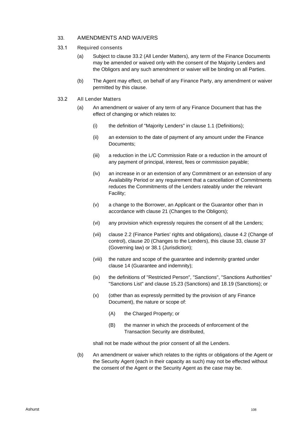 Ashurst 108 33. AMENDMENTS AND WAIVERS Required consents (a) Subject to clause 33.2 (All Lender Matters), any term of the Finance Documents may be amended or waived only with the consent of the Majority Lenders and the Obligors and any such amendment or waiver will be binding on all Parties. (b) The Agent may effect, on behalf of any Finance Party, any amendment or waiver permitted by this clause. All Lender Matters (a) An amendment or waiver of any term of any Finance Document that has the effect of changing or which relates to: (i) the definition of "Majority Lenders" in clause 1.1 (Definitions); (ii) an extension to the date of payment of any amount under the Finance Documents; (iii) a reduction in the L/C Commission Rate or a reduction in the amount of any payment of principal, interest, fees or commission payable; (iv) an increase in or an extension of any Commitment or an extension of any Availability Period or any requirement that a cancellation of Commitments reduces the Commitments of the Lenders rateably under the relevant Facility; (v) a change to the Borrower, an Applicant or the Guarantor other than in accordance with clause 21 (Changes to the Obligors); (vi) any provision which expressly requires the consent of all the Lenders; (vii) clause 2.2 (Finance Parties' rights and obligations), clause 4.2 (Change of control), clause 20 (Changes to the Lenders), this clause 33, clause 37 (Governing law) or 38.1 (Jurisdiction); (viii) the nature and scope of the guarantee and indemnity granted under clause 14 (Guarantee and indemnity); (ix) the definitions of "Restricted Person", "Sanctions", "Sanctions Authorities" "Sanctions List" and clause 15.23 (Sanctions) and 18.19 (Sanctions); or (x) (other than as expressly permitted by the provision of any Finance Document), the nature or scope of: (A) the Charged Property; or (B) the manner in which the proceeds of enforcement of the Transaction Security are distributed, shall not be made without the prior consent of all the Lenders. (b) An amendment or waiver which relates to the rights or obligations of the Agent or the Security Agent (each in their capacity as such) may not be effected without the consent of the Agent or the Security Agent as the case may be.