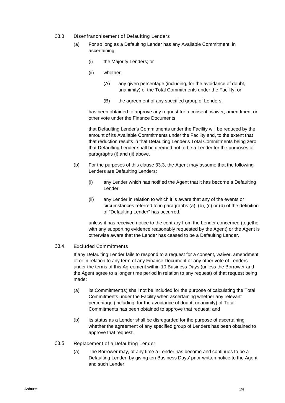 Ashurst 109 Disenfranchisement of Defaulting Lenders (a) For so long as a Defaulting Lender has any Available Commitment, in ascertaining: (i) the Majority Lenders; or (ii) whether: (A) any given percentage (including, for the avoidance of doubt, unanimity) of the Total Commitments under the Facility; or (B) the agreement of any specified group of Lenders, has been obtained to approve any request for a consent, waiver, amendment or other vote under the Finance Documents, that Defaulting Lender's Commitments under the Facility will be reduced by the amount of its Available Commitments under the Facility and, to the extent that that reduction results in that Defaulting Lender's Total Commitments being zero, that Defaulting Lender shall be deemed not to be a Lender for the purposes of paragraphs (i) and (ii) above. (b) For the purposes of this clause 33.3, the Agent may assume that the following Lenders are Defaulting Lenders: (i) any Lender which has notified the Agent that it has become a Defaulting Lender; (ii) any Lender in relation to which it is aware that any of the events or circumstances referred to in paragraphs (a), (b), (c) or (d) of the definition of "Defaulting Lender" has occurred, unless it has received notice to the contrary from the Lender concerned (together with any supporting evidence reasonably requested by the Agent) or the Agent is otherwise aware that the Lender has ceased to be a Defaulting Lender. Excluded Commitments If any Defaulting Lender fails to respond to a request for a consent, waiver, amendment of or in relation to any term of any Finance Document or any other vote of Lenders under the terms of this Agreement within 10 Business Days (unless the Borrower and the Agent agree to a longer time period in relation to any request) of that request being made: (a) its Commitment(s) shall not be included for the purpose of calculating the Total Commitments under the Facility when ascertaining whether any relevant percentage (including, for the avoidance of doubt, unanimity) of Total Commitments has been obtained to approve that request; and (b) its status as a Lender shall be disregarded for the purpose of ascertaining whether the agreement of any specified group of Lenders has been obtained to approve that request. Replacement of a Defaulting Lender (a) The Borrower may, at any time a Lender has become and continues to be a Defaulting Lender, by giving ten Business Days' prior written notice to the Agent and such Lender: