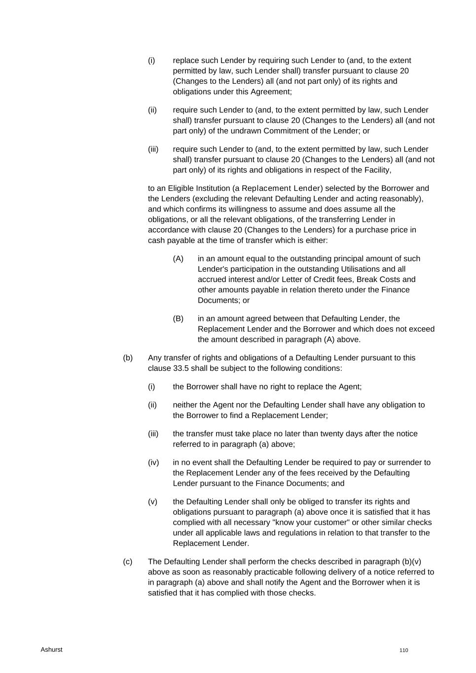 Ashurst 110 (i) replace such Lender by requiring such Lender to (and, to the extent permitted by law, such Lender shall) transfer pursuant to clause 20 (Changes to the Lenders) all (and not part only) of its rights and obligations under this Agreement; (ii) require such Lender to (and, to the extent permitted by law, such Lender shall) transfer pursuant to clause 20 (Changes to the Lenders) all (and not part only) of the undrawn Commitment of the Lender; or (iii) require such Lender to (and, to the extent permitted by law, such Lender shall) transfer pursuant to clause 20 (Changes to the Lenders) all (and not part only) of its rights and obligations in respect of the Facility, to an Eligible Institution (a Replacement Lender) selected by the Borrower and the Lenders (excluding the relevant Defaulting Lender and acting reasonably), and which confirms its willingness to assume and does assume all the obligations, or all the relevant obligations, of the transferring Lender in accordance with clause 20 (Changes to the Lenders) for a purchase price in cash payable at the time of transfer which is either: (A) in an amount equal to the outstanding principal amount of such Lender's participation in the outstanding Utilisations and all accrued interest and/or Letter of Credit fees, Break Costs and other amounts payable in relation thereto under the Finance Documents; or (B) in an amount agreed between that Defaulting Lender, the Replacement Lender and the Borrower and which does not exceed the amount described in paragraph (A) above. (b) Any transfer of rights and obligations of a Defaulting Lender pursuant to this clause 33.5 shall be subject to the following conditions: (i) the Borrower shall have no right to replace the Agent; (ii) neither the Agent nor the Defaulting Lender shall have any obligation to the Borrower to find a Replacement Lender; (iii) the transfer must take place no later than twenty days after the notice referred to in paragraph (a) above; (iv) in no event shall the Defaulting Lender be required to pay or surrender to the Replacement Lender any of the fees received by the Defaulting Lender pursuant to the Finance Documents; and (v) the Defaulting Lender shall only be obliged to transfer its rights and obligations pursuant to paragraph (a) above once it is satisfied that it has complied with all necessary "know your customer" or other similar checks under all applicable laws and regulations in relation to that transfer to the Replacement Lender. (c) The Defaulting Lender shall perform the checks described in paragraph (b)(v) above as soon as reasonably practicable following delivery of a notice referred to in paragraph (a) above and shall notify the Agent and the Borrower when it is satisfied that it has complied with those checks.