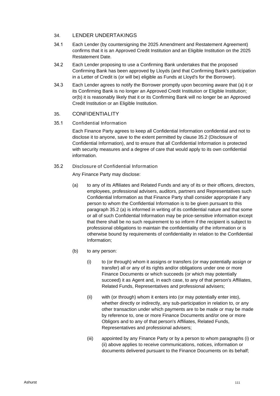 Ashurst 111 34. LENDER UNDERTAKINGS Each Lender (by countersigning the 2025 Amendment and Restatement Agreement) confirms that it is an Approved Credit Institution and an Eligible Institution on the 2025 Restatement Date. Each Lender proposing to use a Confirming Bank undertakes that the proposed Confirming Bank has been approved by Lloyds (and that Confirming Bank's participation in a Letter of Credit is (or will be) eligible as Funds at Lloyd's for the Borrower). Each Lender agrees to notify the Borrower promptly upon becoming aware that (a) it or its Confirming Bank is no longer an Approved Credit Institution or Eligible Institution; or(b) it is reasonably likely that it or its Confirming Bank will no longer be an Approved Credit Institution or an Eligible Institution. 35. CONFIDENTIALITY Confidential Information Each Finance Party agrees to keep all Confidential Information confidential and not to disclose it to anyone, save to the extent permitted by clause 35.2 (Disclosure of Confidential Information), and to ensure that all Confidential Information is protected with security measures and a degree of care that would apply to its own confidential information. Disclosure of Confidential Information Any Finance Party may disclose: (a) to any of its Affiliates and Related Funds and any of its or their officers, directors, employees, professional advisers, auditors, partners and Representatives such Confidential Information as that Finance Party shall consider appropriate if any person to whom the Confidential Information is to be given pursuant to this paragraph 35.2 (a) is informed in writing of its confidential nature and that some or all of such Confidential Information may be price-sensitive information except that there shall be no such requirement to so inform if the recipient is subject to professional obligations to maintain the confidentiality of the information or is otherwise bound by requirements of confidentiality in relation to the Confidential Information; (b) to any person: (i) to (or through) whom it assigns or transfers (or may potentially assign or transfer) all or any of its rights and/or obligations under one or more Finance Documents or which succeeds (or which may potentially succeed) it as Agent and, in each case, to any of that person's Affiliates, Related Funds, Representatives and professional advisers; (ii) with (or through) whom it enters into (or may potentially enter into), whether directly or indirectly, any sub-participation in relation to, or any other transaction under which payments are to be made or may be made by reference to, one or more Finance Documents and/or one or more Obligors and to any of that person's Affiliates, Related Funds, Representatives and professional advisers; (iii) appointed by any Finance Party or by a person to whom paragraphs (i) or (ii) above applies to receive communications, notices, information or documents delivered pursuant to the Finance Documents on its behalf;