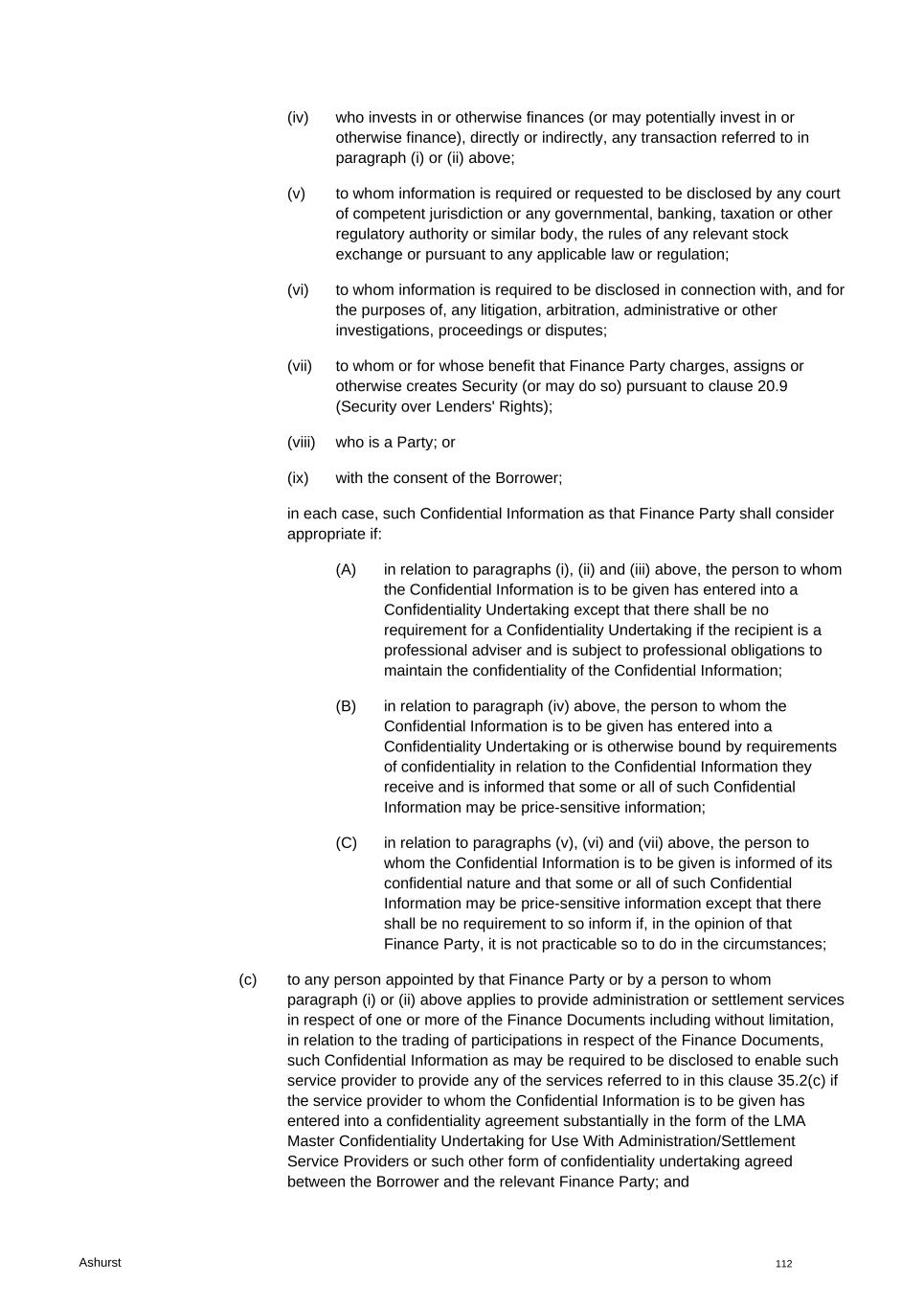 Ashurst 112 (iv) who invests in or otherwise finances (or may potentially invest in or otherwise finance), directly or indirectly, any transaction referred to in paragraph (i) or (ii) above; (v) to whom information is required or requested to be disclosed by any court of competent jurisdiction or any governmental, banking, taxation or other regulatory authority or similar body, the rules of any relevant stock exchange or pursuant to any applicable law or regulation; (vi) to whom information is required to be disclosed in connection with, and for the purposes of, any litigation, arbitration, administrative or other investigations, proceedings or disputes; (vii) to whom or for whose benefit that Finance Party charges, assigns or otherwise creates Security (or may do so) pursuant to clause 20.9 (Security over Lenders' Rights); (viii) who is a Party; or (ix) with the consent of the Borrower; in each case, such Confidential Information as that Finance Party shall consider appropriate if: (A) in relation to paragraphs (i), (ii) and (iii) above, the person to whom the Confidential Information is to be given has entered into a Confidentiality Undertaking except that there shall be no requirement for a Confidentiality Undertaking if the recipient is a professional adviser and is subject to professional obligations to maintain the confidentiality of the Confidential Information; (B) in relation to paragraph (iv) above, the person to whom the Confidential Information is to be given has entered into a Confidentiality Undertaking or is otherwise bound by requirements of confidentiality in relation to the Confidential Information they receive and is informed that some or all of such Confidential Information may be price-sensitive information; (C) in relation to paragraphs (v), (vi) and (vii) above, the person to whom the Confidential Information is to be given is informed of its confidential nature and that some or all of such Confidential Information may be price-sensitive information except that there shall be no requirement to so inform if, in the opinion of that Finance Party, it is not practicable so to do in the circumstances; (c) to any person appointed by that Finance Party or by a person to whom paragraph (i) or (ii) above applies to provide administration or settlement services in respect of one or more of the Finance Documents including without limitation, in relation to the trading of participations in respect of the Finance Documents, such Confidential Information as may be required to be disclosed to enable such service provider to provide any of the services referred to in this clause 35.2(c) if the service provider to whom the Confidential Information is to be given has entered into a confidentiality agreement substantially in the form of the LMA Master Confidentiality Undertaking for Use With Administration/Settlement Service Providers or such other form of confidentiality undertaking agreed between the Borrower and the relevant Finance Party; and