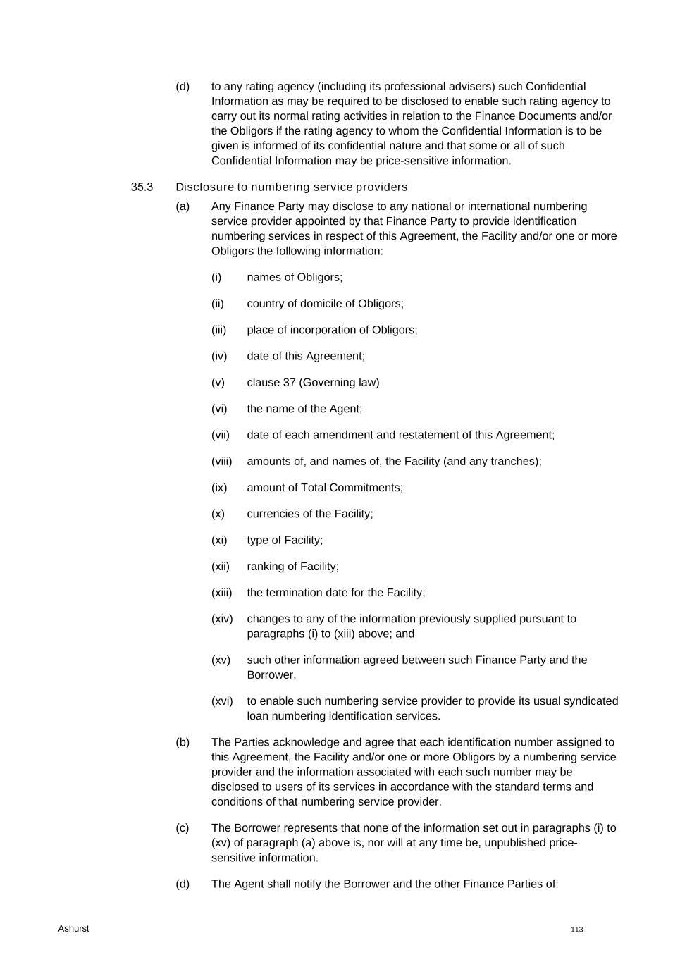 Ashurst 113 (d) to any rating agency (including its professional advisers) such Confidential Information as may be required to be disclosed to enable such rating agency to carry out its normal rating activities in relation to the Finance Documents and/or the Obligors if the rating agency to whom the Confidential Information is to be given is informed of its confidential nature and that some or all of such Confidential Information may be price-sensitive information. Disclosure to numbering service providers (a) Any Finance Party may disclose to any national or international numbering service provider appointed by that Finance Party to provide identification numbering services in respect of this Agreement, the Facility and/or one or more Obligors the following information: (i) names of Obligors; (ii) country of domicile of Obligors; (iii) place of incorporation of Obligors; (iv) date of this Agreement; (v) clause 37 (Governing law) (vi) the name of the Agent; (vii) date of each amendment and restatement of this Agreement; (viii) amounts of, and names of, the Facility (and any tranches); (ix) amount of Total Commitments; (x) currencies of the Facility; (xi) type of Facility; (xii) ranking of Facility; (xiii) the termination date for the Facility; (xiv) changes to any of the information previously supplied pursuant to paragraphs (i) to (xiii) above; and (xv) such other information agreed between such Finance Party and the Borrower, (xvi) to enable such numbering service provider to provide its usual syndicated loan numbering identification services. (b) The Parties acknowledge and agree that each identification number assigned to this Agreement, the Facility and/or one or more Obligors by a numbering service provider and the information associated with each such number may be disclosed to users of its services in accordance with the standard terms and conditions of that numbering service provider. (c) The Borrower represents that none of the information set out in paragraphs (i) to (xv) of paragraph (a) above is, nor will at any time be, unpublished price- sensitive information. (d) The Agent shall notify the Borrower and the other Finance Parties of: