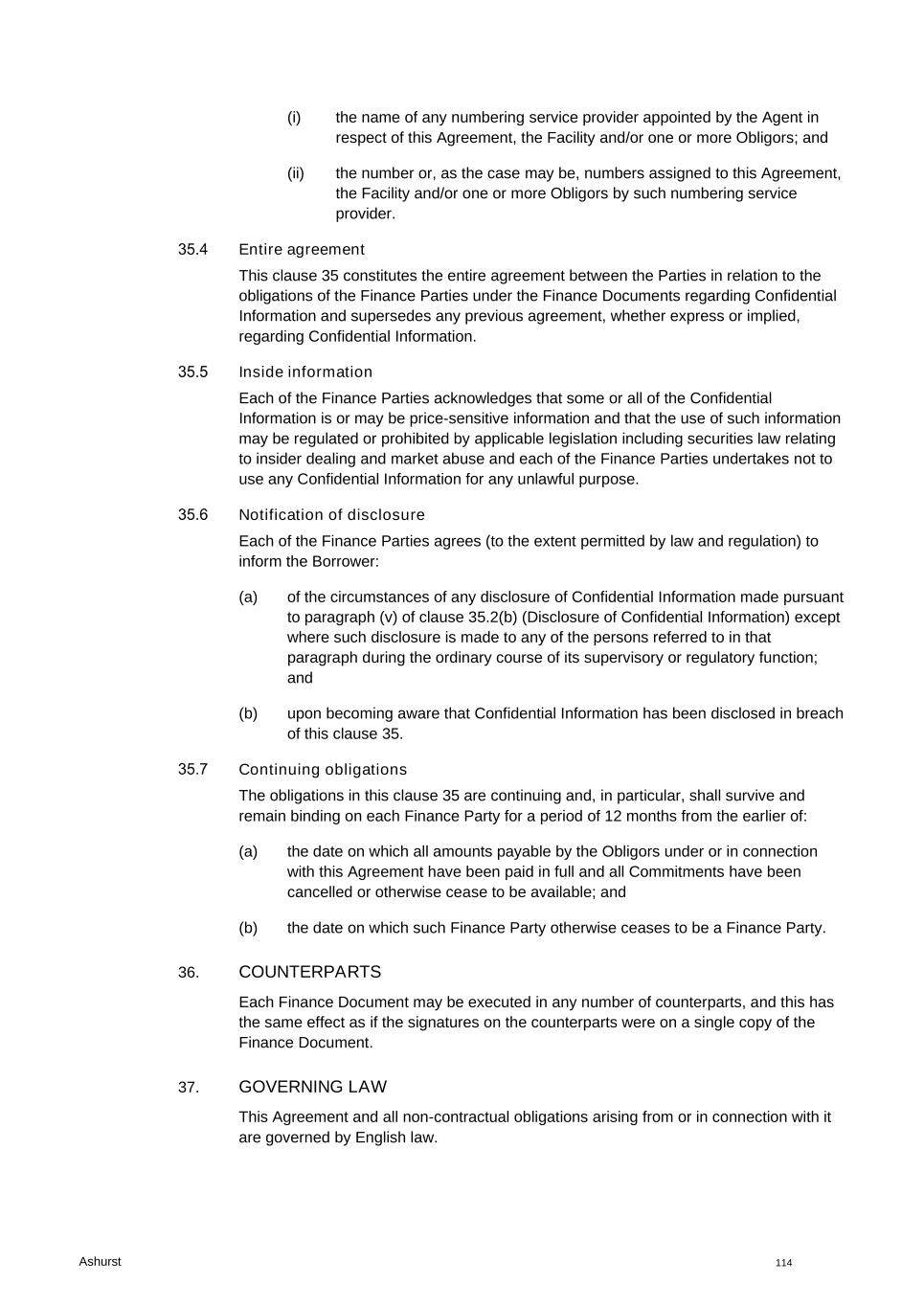 Ashurst 114 (i) the name of any numbering service provider appointed by the Agent in respect of this Agreement, the Facility and/or one or more Obligors; and (ii) the number or, as the case may be, numbers assigned to this Agreement, the Facility and/or one or more Obligors by such numbering service provider. Entire agreement This clause 35 constitutes the entire agreement between the Parties in relation to the obligations of the Finance Parties under the Finance Documents regarding Confidential Information and supersedes any previous agreement, whether express or implied, regarding Confidential Information. Inside information Each of the Finance Parties acknowledges that some or all of the Confidential Information is or may be price-sensitive information and that the use of such information may be regulated or prohibited by applicable legislation including securities law relating to insider dealing and market abuse and each of the Finance Parties undertakes not to use any Confidential Information for any unlawful purpose. Notification of disclosure Each of the Finance Parties agrees (to the extent permitted by law and regulation) to inform the Borrower: (a) of the circumstances of any disclosure of Confidential Information made pursuant to paragraph (v) of clause 35.2(b) (Disclosure of Confidential Information) except where such disclosure is made to any of the persons referred to in that paragraph during the ordinary course of its supervisory or regulatory function; and (b) upon becoming aware that Confidential Information has been disclosed in breach of this clause 35. Continuing obligations The obligations in this clause 35 are continuing and, in particular, shall survive and remain binding on each Finance Party for a period of 12 months from the earlier of: (a) the date on which all amounts payable by the Obligors under or in connection with this Agreement have been paid in full and all Commitments have been cancelled or otherwise cease to be available; and (b) the date on which such Finance Party otherwise ceases to be a Finance Party. 36. COUNTERPARTS Each Finance Document may be executed in any number of counterparts, and this has the same effect as if the signatures on the counterparts were on a single copy of the Finance Document. 37. GOVERNING LAW This Agreement and all non-contractual obligations arising from or in connection with it are governed by English law.