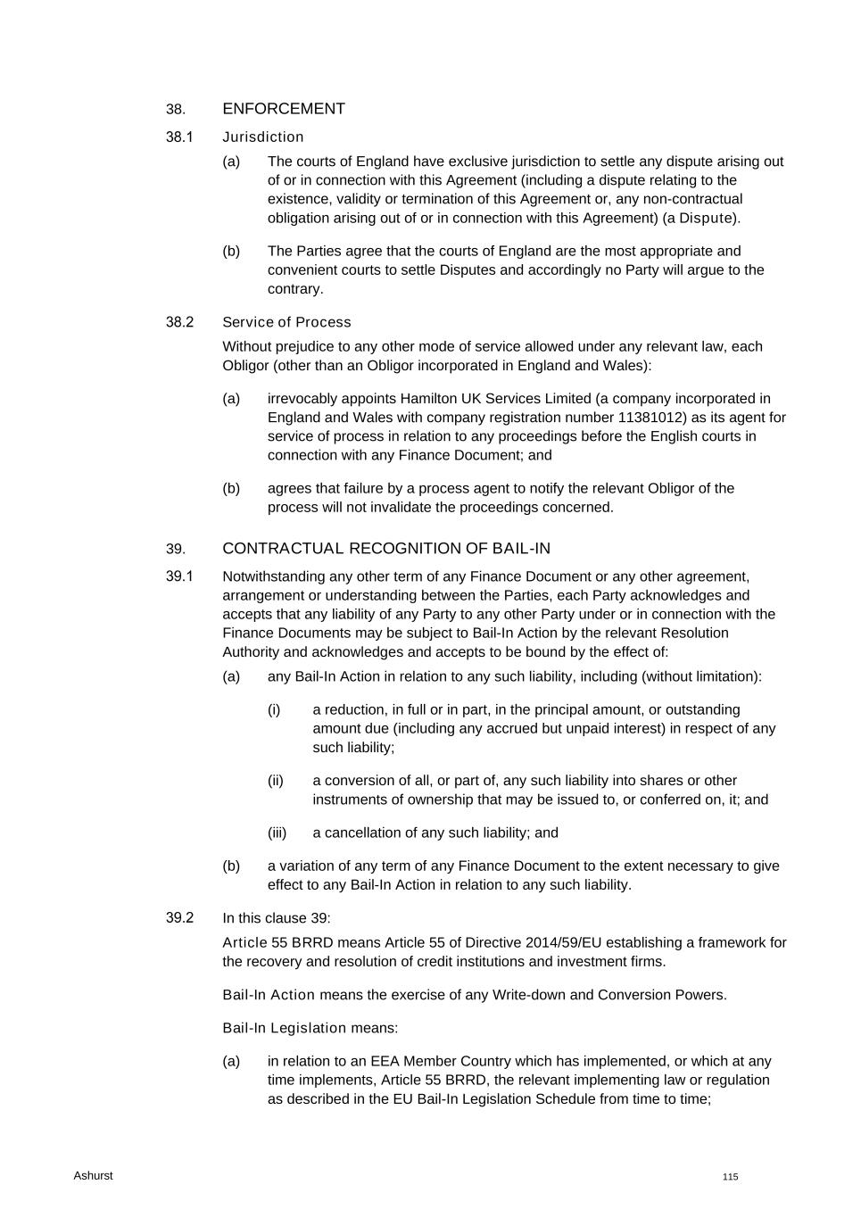 Ashurst 115 38. ENFORCEMENT Jurisdiction (a) The courts of England have exclusive jurisdiction to settle any dispute arising out of or in connection with this Agreement (including a dispute relating to the existence, validity or termination of this Agreement or, any non-contractual obligation arising out of or in connection with this Agreement) (a Dispute). (b) The Parties agree that the courts of England are the most appropriate and convenient courts to settle Disputes and accordingly no Party will argue to the contrary. Service of Process Without prejudice to any other mode of service allowed under any relevant law, each Obligor (other than an Obligor incorporated in England and Wales): (a) irrevocably appoints Hamilton UK Services Limited (a company incorporated in England and Wales with company registration number 11381012) as its agent for service of process in relation to any proceedings before the English courts in connection with any Finance Document; and (b) agrees that failure by a process agent to notify the relevant Obligor of the process will not invalidate the proceedings concerned. 39. CONTRACTUAL RECOGNITION OF BAIL-IN Notwithstanding any other term of any Finance Document or any other agreement, arrangement or understanding between the Parties, each Party acknowledges and accepts that any liability of any Party to any other Party under or in connection with the Finance Documents may be subject to Bail-In Action by the relevant Resolution Authority and acknowledges and accepts to be bound by the effect of: (a) any Bail-In Action in relation to any such liability, including (without limitation): (i) a reduction, in full or in part, in the principal amount, or outstanding amount due (including any accrued but unpaid interest) in respect of any such liability; (ii) a conversion of all, or part of, any such liability into shares or other instruments of ownership that may be issued to, or conferred on, it; and (iii) a cancellation of any such liability; and (b) a variation of any term of any Finance Document to the extent necessary to give effect to any Bail-In Action in relation to any such liability. In this clause 39: Article 55 BRRD means Article 55 of Directive 2014/59/EU establishing a framework for the recovery and resolution of credit institutions and investment firms. Bail-In Action means the exercise of any Write-down and Conversion Powers. Bail-In Legislation means: (a) in relation to an EEA Member Country which has implemented, or which at any time implements, Article 55 BRRD, the relevant implementing law or regulation as described in the EU Bail-In Legislation Schedule from time to time;