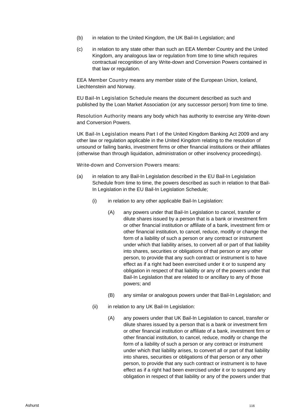 Ashurst 116 (b) in relation to the United Kingdom, the UK Bail-In Legislation; and (c) in relation to any state other than such an EEA Member Country and the United Kingdom, any analogous law or regulation from time to time which requires contractual recognition of any Write-down and Conversion Powers contained in that law or regulation. EEA Member Country means any member state of the European Union, Iceland, Liechtenstein and Norway. EU Bail-In Legislation Schedule means the document described as such and published by the Loan Market Association (or any successor person) from time to time. Resolution Authority means any body which has authority to exercise any Write-down and Conversion Powers. UK Bail-In Legislation means Part I of the United Kingdom Banking Act 2009 and any other law or regulation applicable in the United Kingdom relating to the resolution of unsound or failing banks, investment firms or other financial institutions or their affiliates (otherwise than through liquidation, administration or other insolvency proceedings). Write-down and Conversion Powers means: (a) in relation to any Bail-In Legislation described in the EU Bail-In Legislation Schedule from time to time, the powers described as such in relation to that Bail- In Legislation in the EU Bail-In Legislation Schedule; (i) in relation to any other applicable Bail-In Legislation: (A) any powers under that Bail-In Legislation to cancel, transfer or dilute shares issued by a person that is a bank or investment firm or other financial institution or affiliate of a bank, investment firm or other financial institution, to cancel, reduce, modify or change the form of a liability of such a person or any contract or instrument under which that liability arises, to convert all or part of that liability into shares, securities or obligations of that person or any other person, to provide that any such contract or instrument is to have effect as if a right had been exercised under it or to suspend any obligation in respect of that liability or any of the powers under that Bail-In Legislation that are related to or ancillary to any of those powers; and (B) any similar or analogous powers under that Bail-In Legislation; and (ii) in relation to any UK Bail-In Legislation: (A) any powers under that UK Bail-In Legislation to cancel, transfer or dilute shares issued by a person that is a bank or investment firm or other financial institution or affiliate of a bank, investment firm or other financial institution, to cancel, reduce, modify or change the form of a liability of such a person or any contract or instrument under which that liability arises, to convert all or part of that liability into shares, securities or obligations of that person or any other person, to provide that any such contract or instrument is to have effect as if a right had been exercised under it or to suspend any obligation in respect of that liability or any of the powers under that