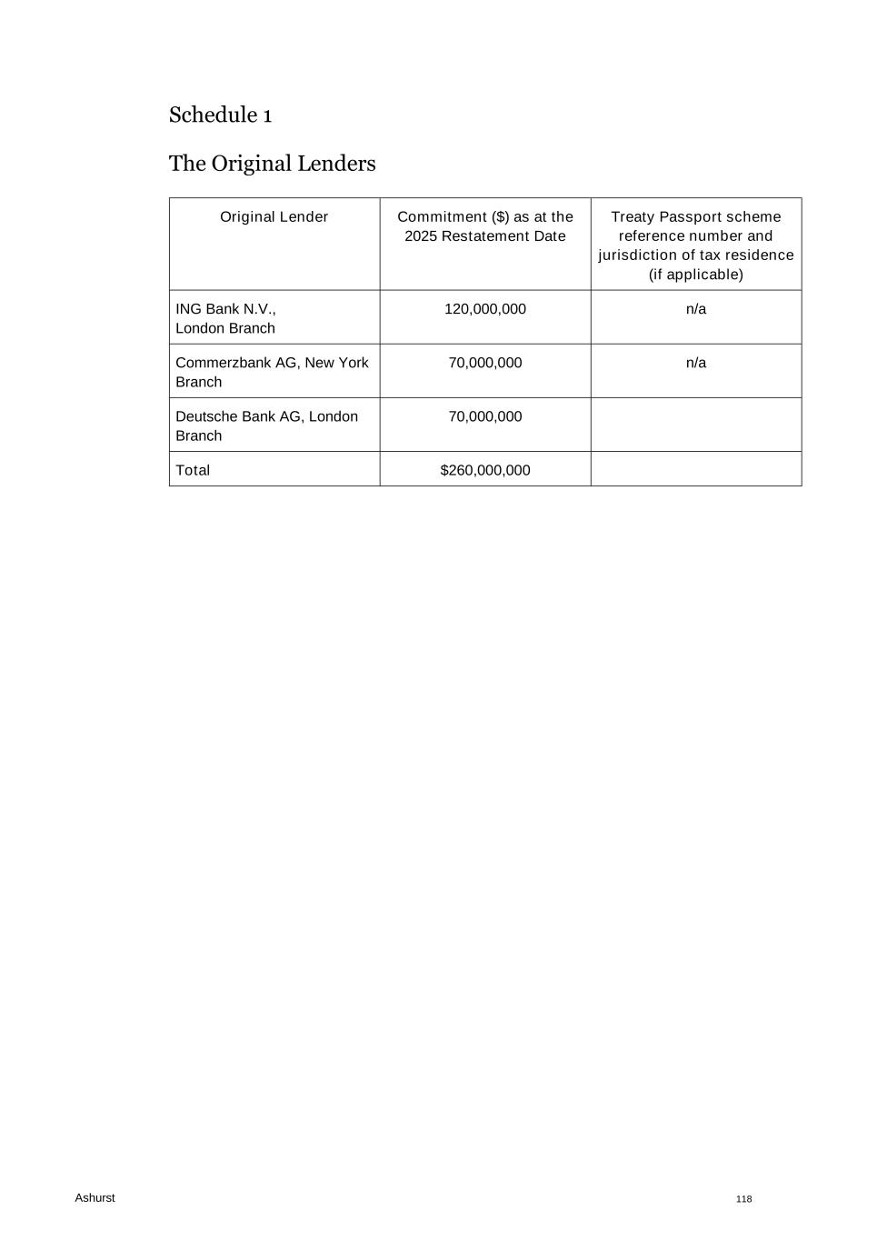 Ashurst 118 Schedule 1 The Original Lenders Original Lender Commitment ($) as at the 2025 Restatement Date Treaty Passport scheme reference number and jurisdiction of tax residence (if applicable) ING Bank N.V., London Branch 120,000,000 n/a Commerzbank AG, New York Branch 70,000,000 n/a Deutsche Bank AG, London Branch 70,000,000 Total $260,000,000