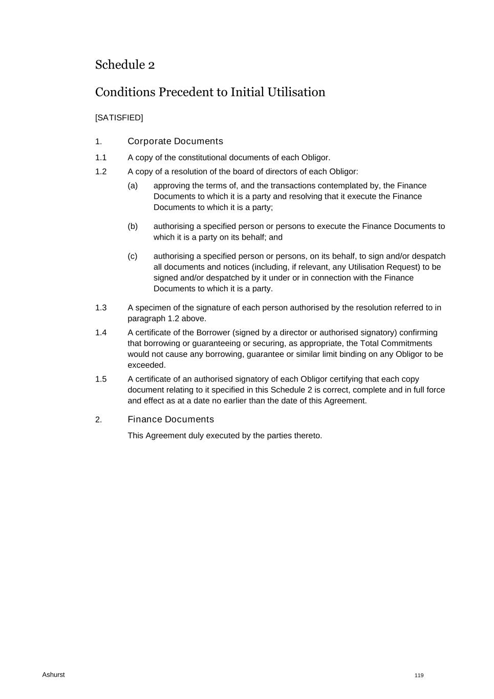Ashurst 119 Schedule 2 Conditions Precedent to Initial Utilisation [SATISFIED] 1. Corporate Documents 1.1 A copy of the constitutional documents of each Obligor. 1.2 A copy of a resolution of the board of directors of each Obligor: (a) approving the terms of, and the transactions contemplated by, the Finance Documents to which it is a party and resolving that it execute the Finance Documents to which it is a party; (b) authorising a specified person or persons to execute the Finance Documents to which it is a party on its behalf; and (c) authorising a specified person or persons, on its behalf, to sign and/or despatch all documents and notices (including, if relevant, any Utilisation Request) to be signed and/or despatched by it under or in connection with the Finance Documents to which it is a party. 1.3 A specimen of the signature of each person authorised by the resolution referred to in paragraph 1.2 above. 1.4 A certificate of the Borrower (signed by a director or authorised signatory) confirming that borrowing or guaranteeing or securing, as appropriate, the Total Commitments would not cause any borrowing, guarantee or similar limit binding on any Obligor to be exceeded. 1.5 A certificate of an authorised signatory of each Obligor certifying that each copy document relating to it specified in this Schedule 2 is correct, complete and in full force and effect as at a date no earlier than the date of this Agreement. 2. Finance Documents This Agreement duly executed by the parties thereto.