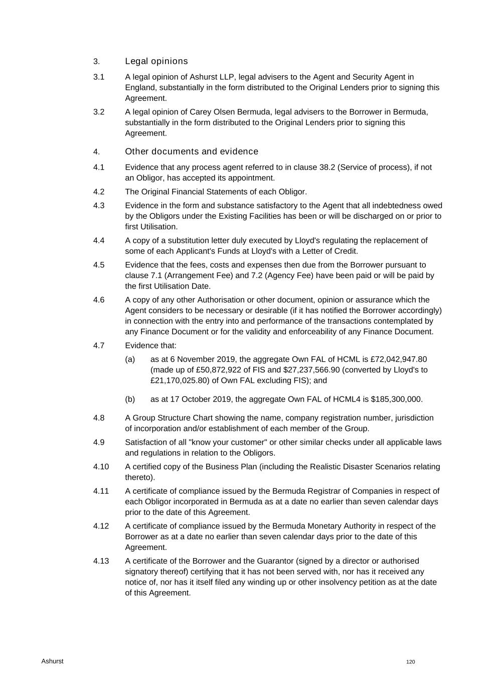 Ashurst 120 3. Legal opinions 3.1 A legal opinion of Ashurst LLP, legal advisers to the Agent and Security Agent in England, substantially in the form distributed to the Original Lenders prior to signing this Agreement. 3.2 A legal opinion of Carey Olsen Bermuda, legal advisers to the Borrower in Bermuda, substantially in the form distributed to the Original Lenders prior to signing this Agreement. 4. Other documents and evidence 4.1 Evidence that any process agent referred to in clause 38.2 (Service of process), if not an Obligor, has accepted its appointment. 4.2 The Original Financial Statements of each Obligor. 4.3 Evidence in the form and substance satisfactory to the Agent that all indebtedness owed by the Obligors under the Existing Facilities has been or will be discharged on or prior to first Utilisation. 4.4 A copy of a substitution letter duly executed by Lloyd's regulating the replacement of some of each Applicant's Funds at Lloyd's with a Letter of Credit. 4.5 Evidence that the fees, costs and expenses then due from the Borrower pursuant to clause 7.1 (Arrangement Fee) and 7.2 (Agency Fee) have been paid or will be paid by the first Utilisation Date. 4.6 A copy of any other Authorisation or other document, opinion or assurance which the Agent considers to be necessary or desirable (if it has notified the Borrower accordingly) in connection with the entry into and performance of the transactions contemplated by any Finance Document or for the validity and enforceability of any Finance Document. 4.7 Evidence that: (a) as at 6 November 2019, the aggregate Own FAL of HCML is £72,042,947.80 (made up of £50,872,922 of FIS and $27,237,566.90 (converted by Lloyd's to £21,170,025.80) of Own FAL excluding FIS); and (b) as at 17 October 2019, the aggregate Own FAL of HCML4 is $185,300,000. 4.8 A Group Structure Chart showing the name, company registration number, jurisdiction of incorporation and/or establishment of each member of the Group. 4.9 Satisfaction of all "know your customer" or other similar checks under all applicable laws and regulations in relation to the Obligors. 4.10 A certified copy of the Business Plan (including the Realistic Disaster Scenarios relating thereto). 4.11 A certificate of compliance issued by the Bermuda Registrar of Companies in respect of each Obligor incorporated in Bermuda as at a date no earlier than seven calendar days prior to the date of this Agreement. 4.12 A certificate of compliance issued by the Bermuda Monetary Authority in respect of the Borrower as at a date no earlier than seven calendar days prior to the date of this Agreement. 4.13 A certificate of the Borrower and the Guarantor (signed by a director or authorised signatory thereof) certifying that it has not been served with, nor has it received any notice of, nor has it itself filed any winding up or other insolvency petition as at the date of this Agreement.