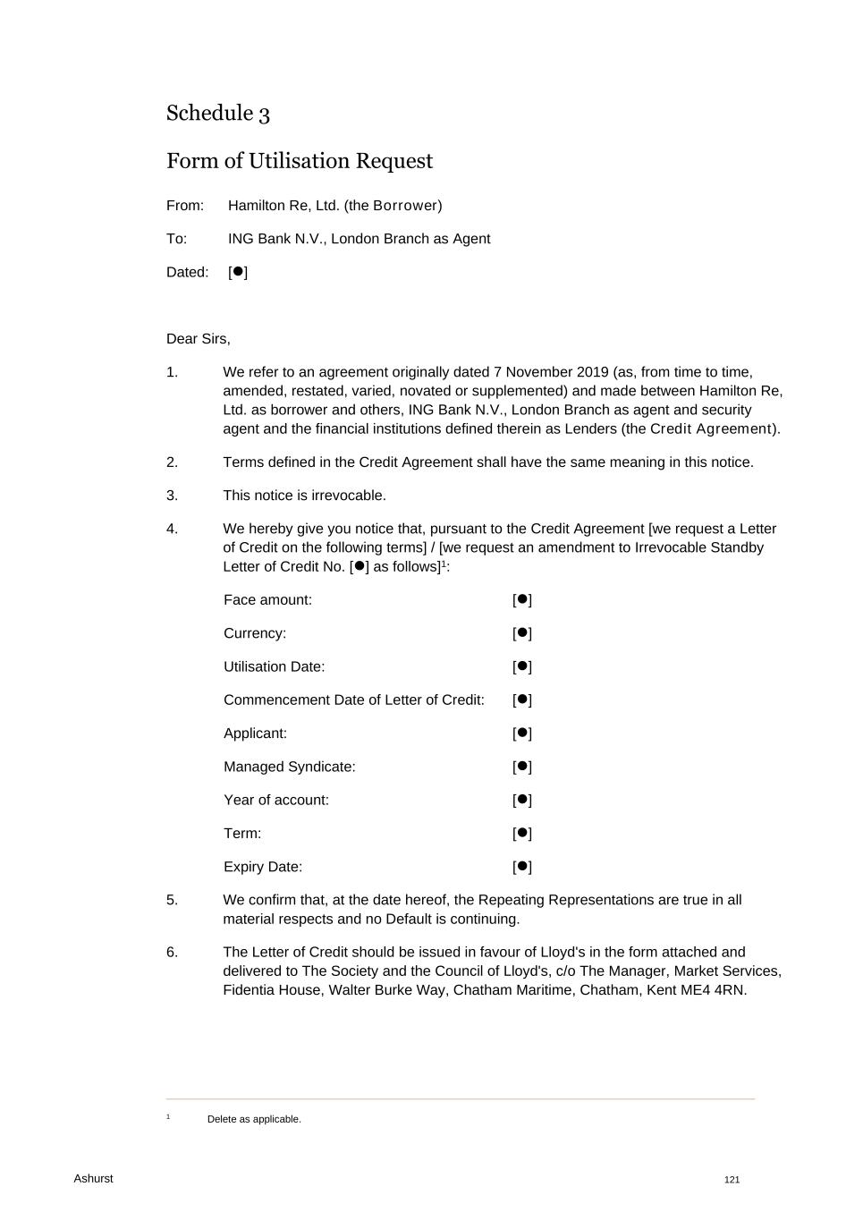 Ashurst 121 Schedule 3 Form of Utilisation Request From: Hamilton Re, Ltd. (the Borrower) To: ING Bank N.V., London Branch as Agent Dated: [] Dear Sirs, 1. We refer to an agreement originally dated 7 November 2019 (as, from time to time, amended, restated, varied, novated or supplemented) and made between Hamilton Re, Ltd. as borrower and others, ING Bank N.V., London Branch as agent and security agent and the financial institutions defined therein as Lenders (the Credit Agreement). 2. Terms defined in the Credit Agreement shall have the same meaning in this notice. 3. This notice is irrevocable. 4. We hereby give you notice that, pursuant to the Credit Agreement [we request a Letter of Credit on the following terms] / [we request an amendment to Irrevocable Standby Letter of Credit No. [] as follows]1: Face amount: [] Currency: [] Utilisation Date: [] Commencement Date of Letter of Credit: [] Applicant: [] Managed Syndicate: [] Year of account: [] Term: [] Expiry Date: [] 5. We confirm that, at the date hereof, the Repeating Representations are true in all material respects and no Default is continuing. 6. The Letter of Credit should be issued in favour of Lloyd's in the form attached and delivered to The Society and the Council of Lloyd's, c/o The Manager, Market Services, Fidentia House, Walter Burke Way, Chatham Maritime, Chatham, Kent ME4 4RN. _________________________________________________________________________ 1 Delete as applicable.