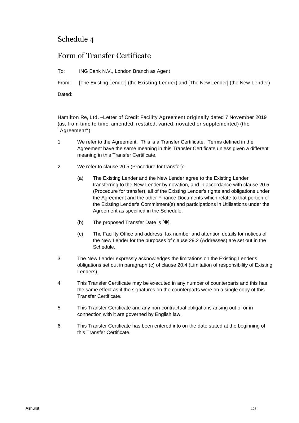 Ashurst 123 Schedule 4 Form of Transfer Certificate To: ING Bank N.V., London Branch as Agent From: [The Existing Lender] (the Existing Lender) and [The New Lender] (the New Lender) Dated: Hamilton Re, Ltd. –Letter of Credit Facility Agreement originally dated 7 November 2019 (as, from time to time, amended, restated, varied, novated or supplemented) (the "Agreement") 1. We refer to the Agreement. This is a Transfer Certificate. Terms defined in the Agreement have the same meaning in this Transfer Certificate unless given a different meaning in this Transfer Certificate. 2. We refer to clause 20.5 (Procedure for transfer): (a) The Existing Lender and the New Lender agree to the Existing Lender transferring to the New Lender by novation, and in accordance with clause 20.5 (Procedure for transfer), all of the Existing Lender's rights and obligations under the Agreement and the other Finance Documents which relate to that portion of the Existing Lender's Commitment(s) and participations in Utilisations under the Agreement as specified in the Schedule. (b) The proposed Transfer Date is []. (c) The Facility Office and address, fax number and attention details for notices of the New Lender for the purposes of clause 29.2 (Addresses) are set out in the Schedule. 3. The New Lender expressly acknowledges the limitations on the Existing Lender's obligations set out in paragraph (c) of clause 20.4 (Limitation of responsibility of Existing Lenders). 4. This Transfer Certificate may be executed in any number of counterparts and this has the same effect as if the signatures on the counterparts were on a single copy of this Transfer Certificate. 5. This Transfer Certificate and any non-contractual obligations arising out of or in connection with it are governed by English law. 6. This Transfer Certificate has been entered into on the date stated at the beginning of this Transfer Certificate.