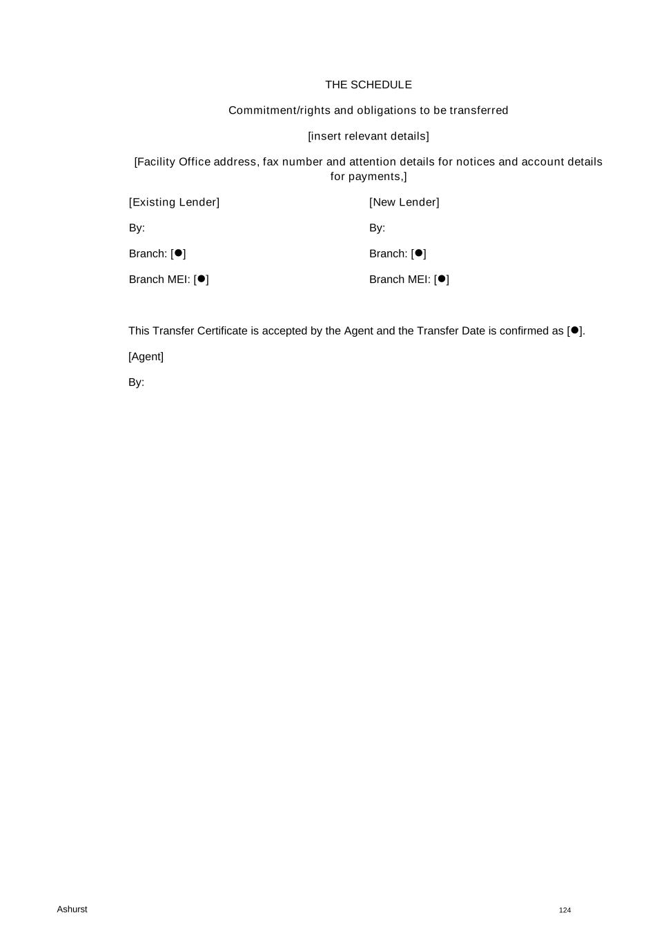 Ashurst 124 THE SCHEDULE Commitment/rights and obligations to be transferred [insert relevant details] [Facility Office address, fax number and attention details for notices and account details for payments,] [Existing Lender] [New Lender] By: By: Branch: [] Branch: [] Branch MEI: [] Branch MEI: [] This Transfer Certificate is accepted by the Agent and the Transfer Date is confirmed as []. [Agent] By: