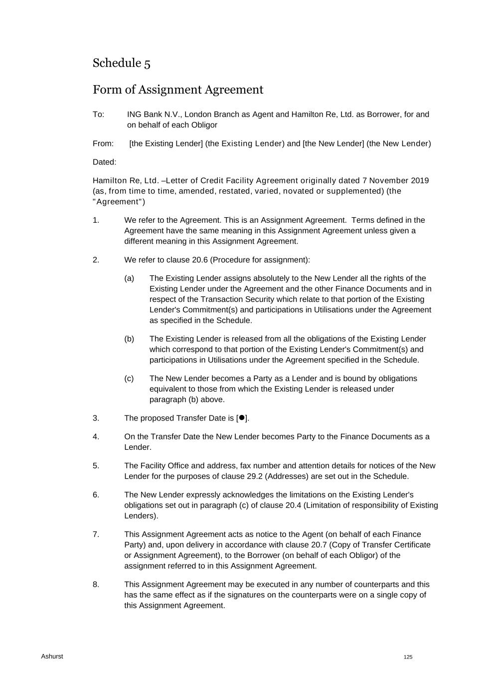 Ashurst 125 Schedule 5 Form of Assignment Agreement To: ING Bank N.V., London Branch as Agent and Hamilton Re, Ltd. as Borrower, for and on behalf of each Obligor From: [the Existing Lender] (the Existing Lender) and [the New Lender] (the New Lender) Dated: Hamilton Re, Ltd. –Letter of Credit Facility Agreement originally dated 7 November 2019 (as, from time to time, amended, restated, varied, novated or supplemented) (the "Agreement") 1. We refer to the Agreement. This is an Assignment Agreement. Terms defined in the Agreement have the same meaning in this Assignment Agreement unless given a different meaning in this Assignment Agreement. 2. We refer to clause 20.6 (Procedure for assignment): (a) The Existing Lender assigns absolutely to the New Lender all the rights of the Existing Lender under the Agreement and the other Finance Documents and in respect of the Transaction Security which relate to that portion of the Existing Lender's Commitment(s) and participations in Utilisations under the Agreement as specified in the Schedule. (b) The Existing Lender is released from all the obligations of the Existing Lender which correspond to that portion of the Existing Lender's Commitment(s) and participations in Utilisations under the Agreement specified in the Schedule. (c) The New Lender becomes a Party as a Lender and is bound by obligations equivalent to those from which the Existing Lender is released under paragraph (b) above. 3. The proposed Transfer Date is []. 4. On the Transfer Date the New Lender becomes Party to the Finance Documents as a Lender. 5. The Facility Office and address, fax number and attention details for notices of the New Lender for the purposes of clause 29.2 (Addresses) are set out in the Schedule. 6. The New Lender expressly acknowledges the limitations on the Existing Lender's obligations set out in paragraph (c) of clause 20.4 (Limitation of responsibility of Existing Lenders). 7. This Assignment Agreement acts as notice to the Agent (on behalf of each Finance Party) and, upon delivery in accordance with clause 20.7 (Copy of Transfer Certificate or Assignment Agreement), to the Borrower (on behalf of each Obligor) of the assignment referred to in this Assignment Agreement. 8. This Assignment Agreement may be executed in any number of counterparts and this has the same effect as if the signatures on the counterparts were on a single copy of this Assignment Agreement.