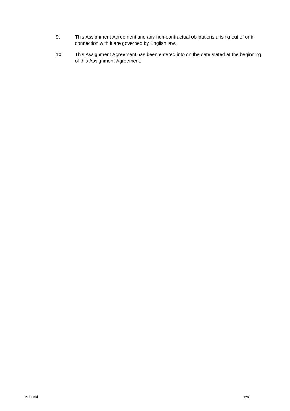 Ashurst 126 9. This Assignment Agreement and any non-contractual obligations arising out of or in connection with it are governed by English law. 10. This Assignment Agreement has been entered into on the date stated at the beginning of this Assignment Agreement.