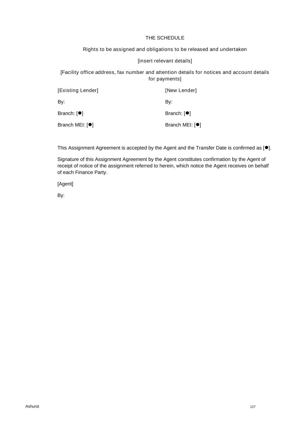 Ashurst 127 THE SCHEDULE Rights to be assigned and obligations to be released and undertaken [insert relevant details] [Facility office address, fax number and attention details for notices and account details for payments] [Existing Lender] [New Lender] By: By: Branch: [] Branch: [] Branch MEI: [] Branch MEI: [] This Assignment Agreement is accepted by the Agent and the Transfer Date is confirmed as []. Signature of this Assignment Agreement by the Agent constitutes confirmation by the Agent of receipt of notice of the assignment referred to herein, which notice the Agent receives on behalf of each Finance Party. [Agent] By: