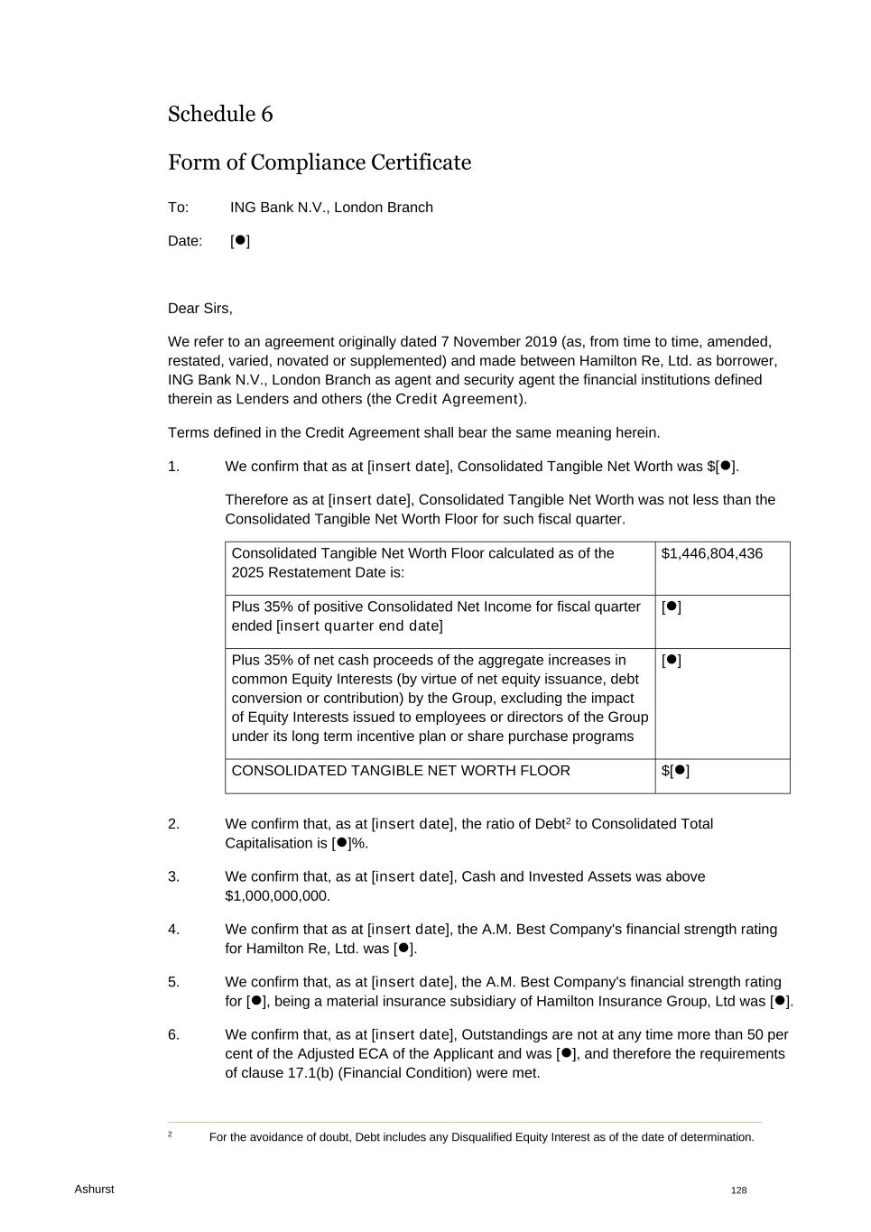 Ashurst 128 Schedule 6 Form of Compliance Certificate To: ING Bank N.V., London Branch Date: [] Dear Sirs, We refer to an agreement originally dated 7 November 2019 (as, from time to time, amended, restated, varied, novated or supplemented) and made between Hamilton Re, Ltd. as borrower, ING Bank N.V., London Branch as agent and security agent the financial institutions defined therein as Lenders and others (the Credit Agreement). Terms defined in the Credit Agreement shall bear the same meaning herein. 1. We confirm that as at [insert date], Consolidated Tangible Net Worth was $[]. Therefore as at [insert date], Consolidated Tangible Net Worth was not less than the Consolidated Tangible Net Worth Floor for such fiscal quarter. Consolidated Tangible Net Worth Floor calculated as of the 2025 Restatement Date is: $1,446,804,436 Plus 35% of positive Consolidated Net Income for fiscal quarter ended [insert quarter end date] [] Plus 35% of net cash proceeds of the aggregate increases in common Equity Interests (by virtue of net equity issuance, debt conversion or contribution) by the Group, excluding the impact of Equity Interests issued to employees or directors of the Group under its long term incentive plan or share purchase programs [] CONSOLIDATED TANGIBLE NET WORTH FLOOR $[] 2. We confirm that, as at [insert date], the ratio of Debt2 to Consolidated Total Capitalisation is []%. 3. We confirm that, as at [insert date], Cash and Invested Assets was above $1,000,000,000. 4. We confirm that as at [insert date], the A.M. Best Company's financial strength rating for Hamilton Re, Ltd. was []. 5. We confirm that, as at [insert date], the A.M. Best Company's financial strength rating for [], being a material insurance subsidiary of Hamilton Insurance Group, Ltd was []. 6. We confirm that, as at [insert date], Outstandings are not at any time more than 50 per cent of the Adjusted ECA of the Applicant and was [], and therefore the requirements of clause 17.1(b) (Financial Condition) were met. _________________________________________________________________________ 2 For the avoidance of doubt, Debt includes any Disqualified Equity Interest as of the date of determination.