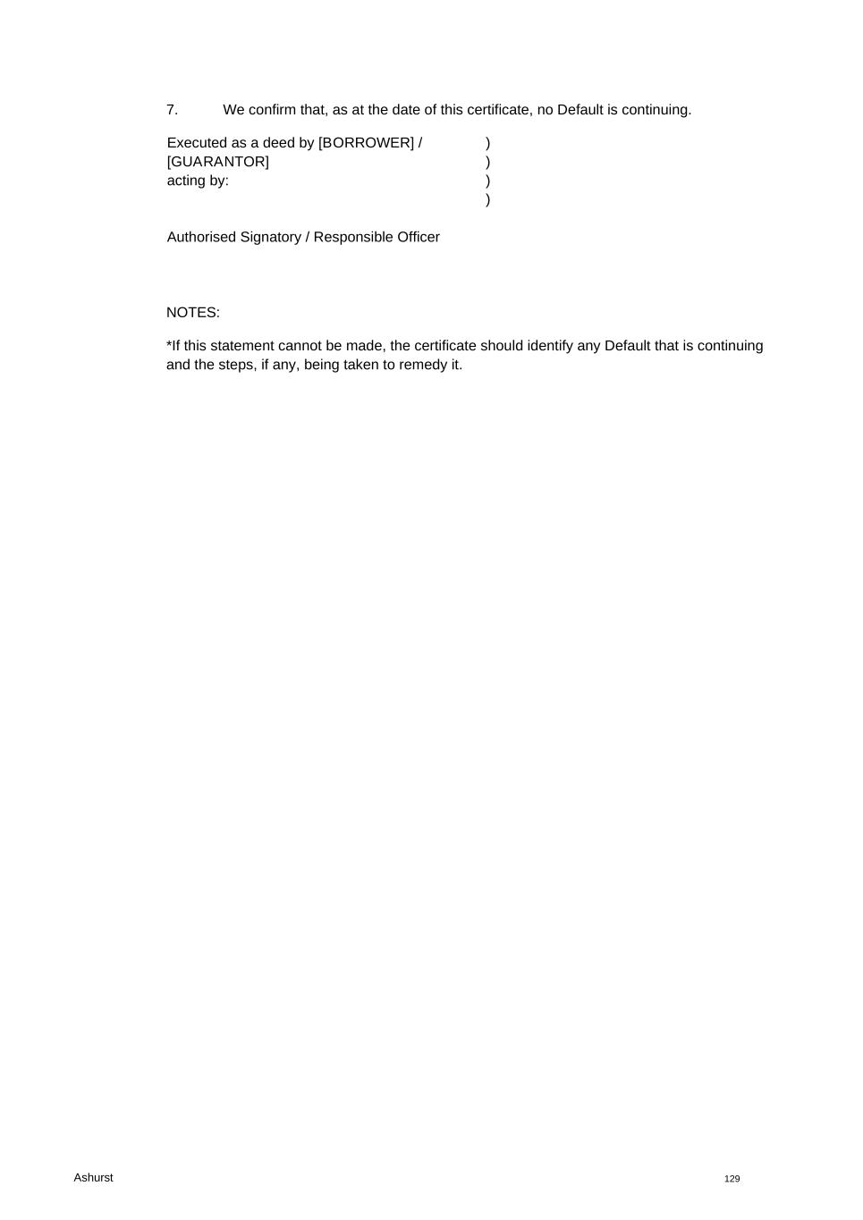 Ashurst 129 7. We confirm that, as at the date of this certificate, no Default is continuing. Executed as a deed by [BORROWER] / [GUARANTOR] acting by: ) ) ) ) Authorised Signatory / Responsible Officer NOTES: *If this statement cannot be made, the certificate should identify any Default that is continuing and the steps, if any, being taken to remedy it.