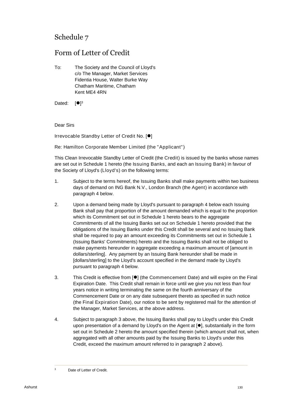 Ashurst 130 Schedule 7 Form of Letter of Credit To: The Society and the Council of Lloyd's c/o The Manager, Market Services Fidentia House, Walter Burke Way Chatham Maritime, Chatham Kent ME4 4RN Dated: []3 Dear Sirs Irrevocable Standby Letter of Credit No. [] Re: Hamilton Corporate Member Limited (the "Applicant") This Clean Irrevocable Standby Letter of Credit (the Credit) is issued by the banks whose names are set out in Schedule 1 hereto (the Issuing Banks, and each an Issuing Bank) in favour of the Society of Lloyd's (Lloyd's) on the following terms: 1. Subject to the terms hereof, the Issuing Banks shall make payments within two business days of demand on ING Bank N.V., London Branch (the Agent) in accordance with paragraph 4 below. 2. Upon a demand being made by Lloyd's pursuant to paragraph 4 below each Issuing Bank shall pay that proportion of the amount demanded which is equal to the proportion which its Commitment set out in Schedule 1 hereto bears to the aggregate Commitments of all the Issuing Banks set out on Schedule 1 hereto provided that the obligations of the Issuing Banks under this Credit shall be several and no Issuing Bank shall be required to pay an amount exceeding its Commitments set out in Schedule 1 (Issuing Banks' Commitments) hereto and the Issuing Banks shall not be obliged to make payments hereunder in aggregate exceeding a maximum amount of [amount in dollars/sterling]. Any payment by an Issuing Bank hereunder shall be made in [dollars/sterling] to the Lloyd's account specified in the demand made by Lloyd's pursuant to paragraph 4 below. 3. This Credit is effective from [] (the Commencement Date) and will expire on the Final Expiration Date. This Credit shall remain in force until we give you not less than four years notice in writing terminating the same on the fourth anniversary of the Commencement Date or on any date subsequent thereto as specified in such notice (the Final Expiration Date), our notice to be sent by registered mail for the attention of the Manager, Market Services, at the above address. 4. Subject to paragraph 3 above, the Issuing Banks shall pay to Lloyd's under this Credit upon presentation of a demand by Lloyd's on the Agent at [], substantially in the form set out in Schedule 2 hereto the amount specified therein (which amount shall not, when aggregated with all other amounts paid by the Issuing Banks to Lloyd's under this Credit, exceed the maximum amount referred to in paragraph 2 above). _________________________________________________________________________ 3 Date of Letter of Credit.