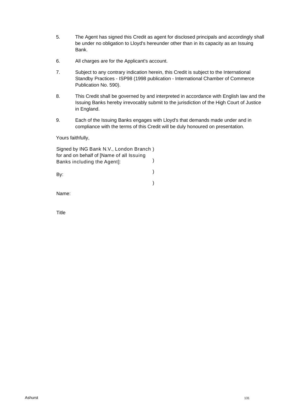 Ashurst 131 5. The Agent has signed this Credit as agent for disclosed principals and accordingly shall be under no obligation to Lloyd's hereunder other than in its capacity as an Issuing Bank. 6. All charges are for the Applicant's account. 7. Subject to any contrary indication herein, this Credit is subject to the International Standby Practices - ISP98 (1998 publication - International Chamber of Commerce Publication No. 590). 8. This Credit shall be governed by and interpreted in accordance with English law and the Issuing Banks hereby irrevocably submit to the jurisdiction of the High Court of Justice in England. 9. Each of the Issuing Banks engages with Lloyd's that demands made under and in compliance with the terms of this Credit will be duly honoured on presentation. Yours faithfully, Signed by ING Bank N.V., London Branch for and on behalf of [Name of all Issuing Banks including the Agent]: By: Name: Title ) ) ) )