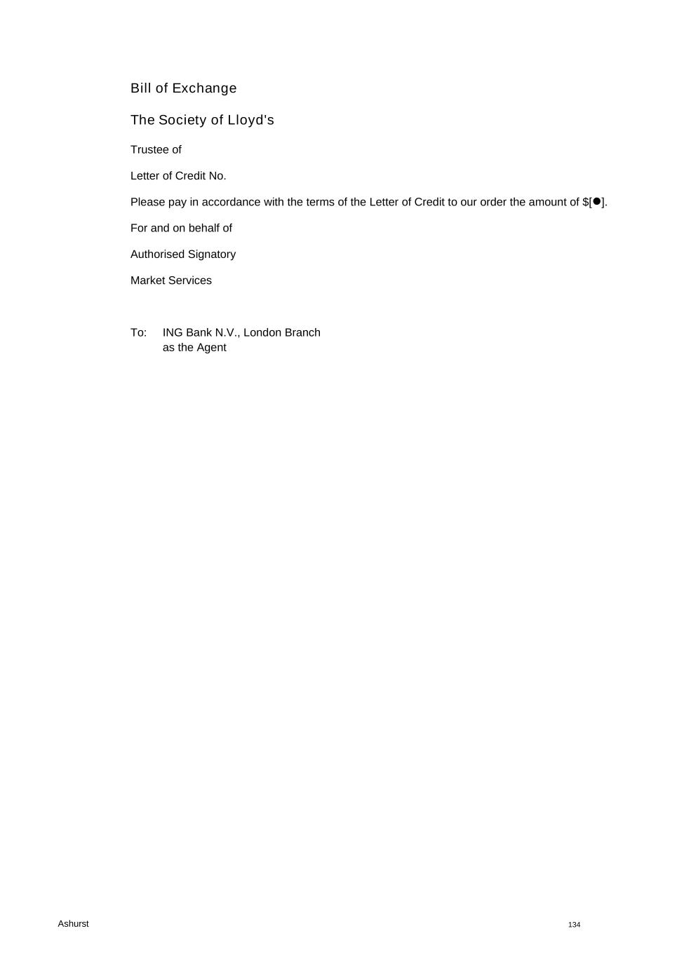 Ashurst 134 Bill of Exchange The Society of Lloyd's Trustee of Letter of Credit No. Please pay in accordance with the terms of the Letter of Credit to our order the amount of $[]. For and on behalf of Authorised Signatory Market Services To: ING Bank N.V., London Branch as the Agent