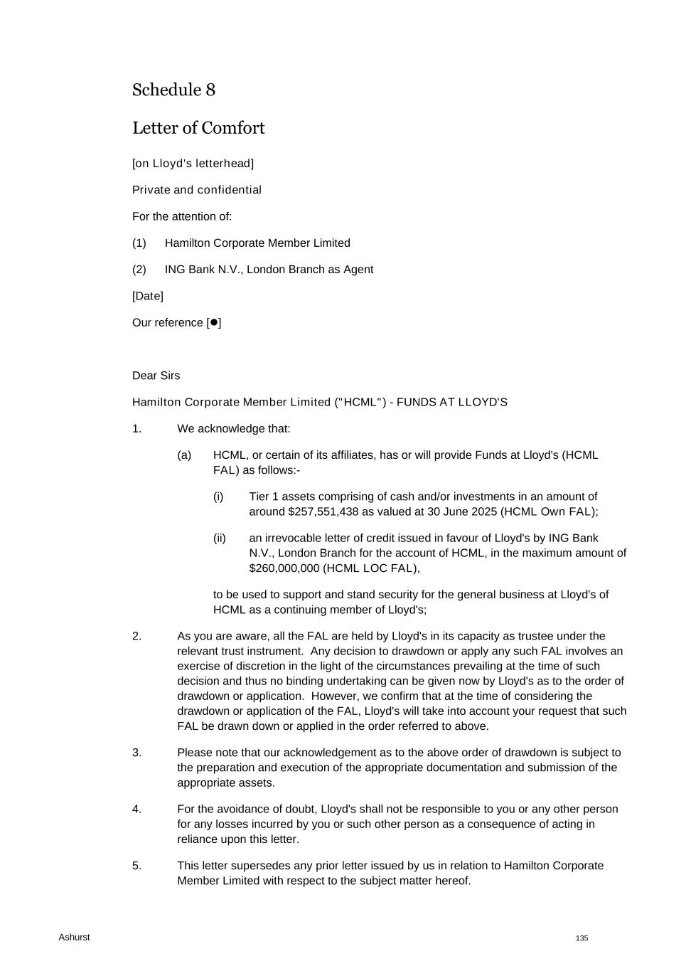 Ashurst 135 Schedule 8 Letter of Comfort [on Lloyd's letterhead] Private and confidential For the attention of: (1) Hamilton Corporate Member Limited (2) ING Bank N.V., London Branch as Agent [Date] Our reference [] Dear Sirs Hamilton Corporate Member Limited ("HCML") - FUNDS AT LLOYD'S 1. We acknowledge that: (a) HCML, or certain of its affiliates, has or will provide Funds at Lloyd's (HCML FAL) as follows:- (i) Tier 1 assets comprising of cash and/or investments in an amount of around $257,551,438 as valued at 30 June 2025 (HCML Own FAL); (ii) an irrevocable letter of credit issued in favour of Lloyd's by ING Bank N.V., London Branch for the account of HCML, in the maximum amount of $260,000,000 (HCML LOC FAL), to be used to support and stand security for the general business at Lloyd's of HCML as a continuing member of Lloyd's; 2. As you are aware, all the FAL are held by Lloyd's in its capacity as trustee under the relevant trust instrument. Any decision to drawdown or apply any such FAL involves an exercise of discretion in the light of the circumstances prevailing at the time of such decision and thus no binding undertaking can be given now by Lloyd's as to the order of drawdown or application. However, we confirm that at the time of considering the drawdown or application of the FAL, Lloyd's will take into account your request that such FAL be drawn down or applied in the order referred to above. 3. Please note that our acknowledgement as to the above order of drawdown is subject to the preparation and execution of the appropriate documentation and submission of the appropriate assets. 4. For the avoidance of doubt, Lloyd's shall not be responsible to you or any other person for any losses incurred by you or such other person as a consequence of acting in reliance upon this letter. 5. This letter supersedes any prior letter issued by us in relation to Hamilton Corporate Member Limited with respect to the subject matter hereof.