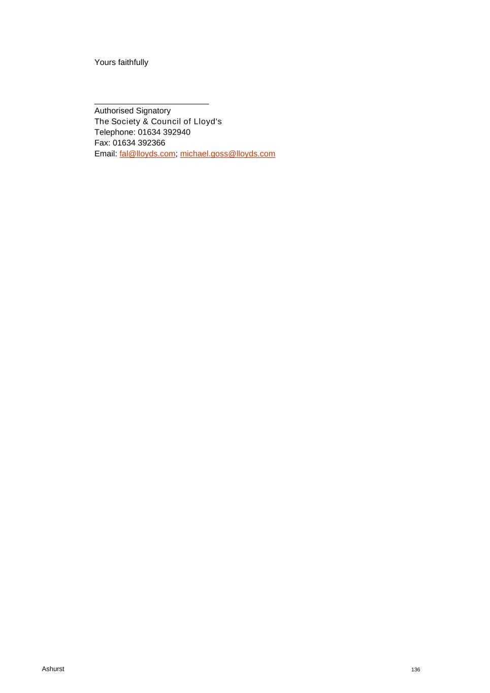 Ashurst 136 Yours faithfully _________________________ Authorised Signatory The Society & Council of Lloyd's Telephone: 01634 392940 Fax: 01634 392366 Email: fal@lloyds.com; michael.goss@lloyds.com
