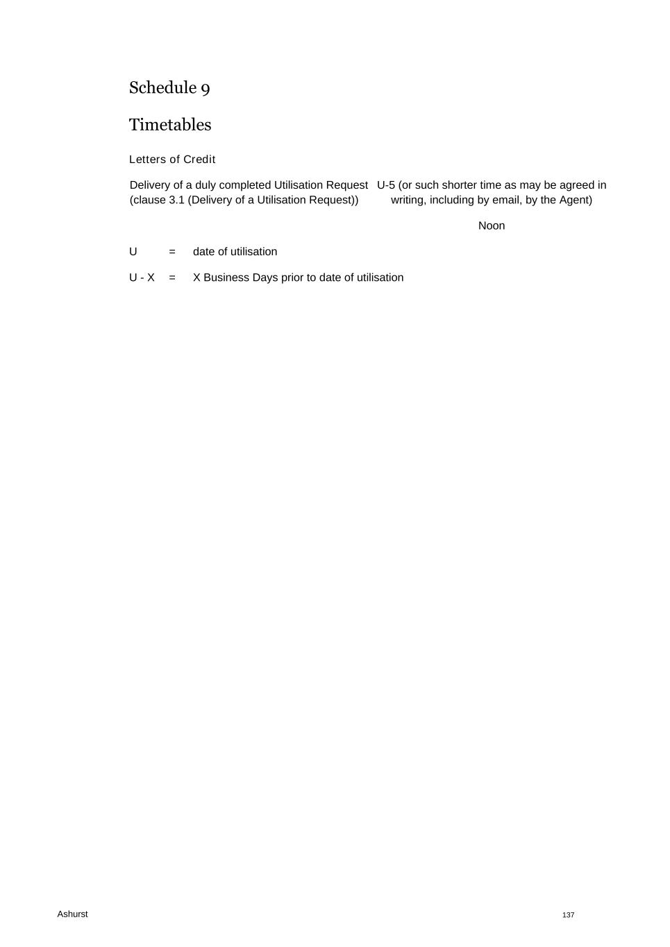 Ashurst 137 Schedule 9 Timetables Letters of Credit Delivery of a duly completed Utilisation Request (clause 3.1 (Delivery of a Utilisation Request)) U-5 (or such shorter time as may be agreed in writing, including by email, by the Agent) Noon U = date of utilisation U - X = X Business Days prior to date of utilisation