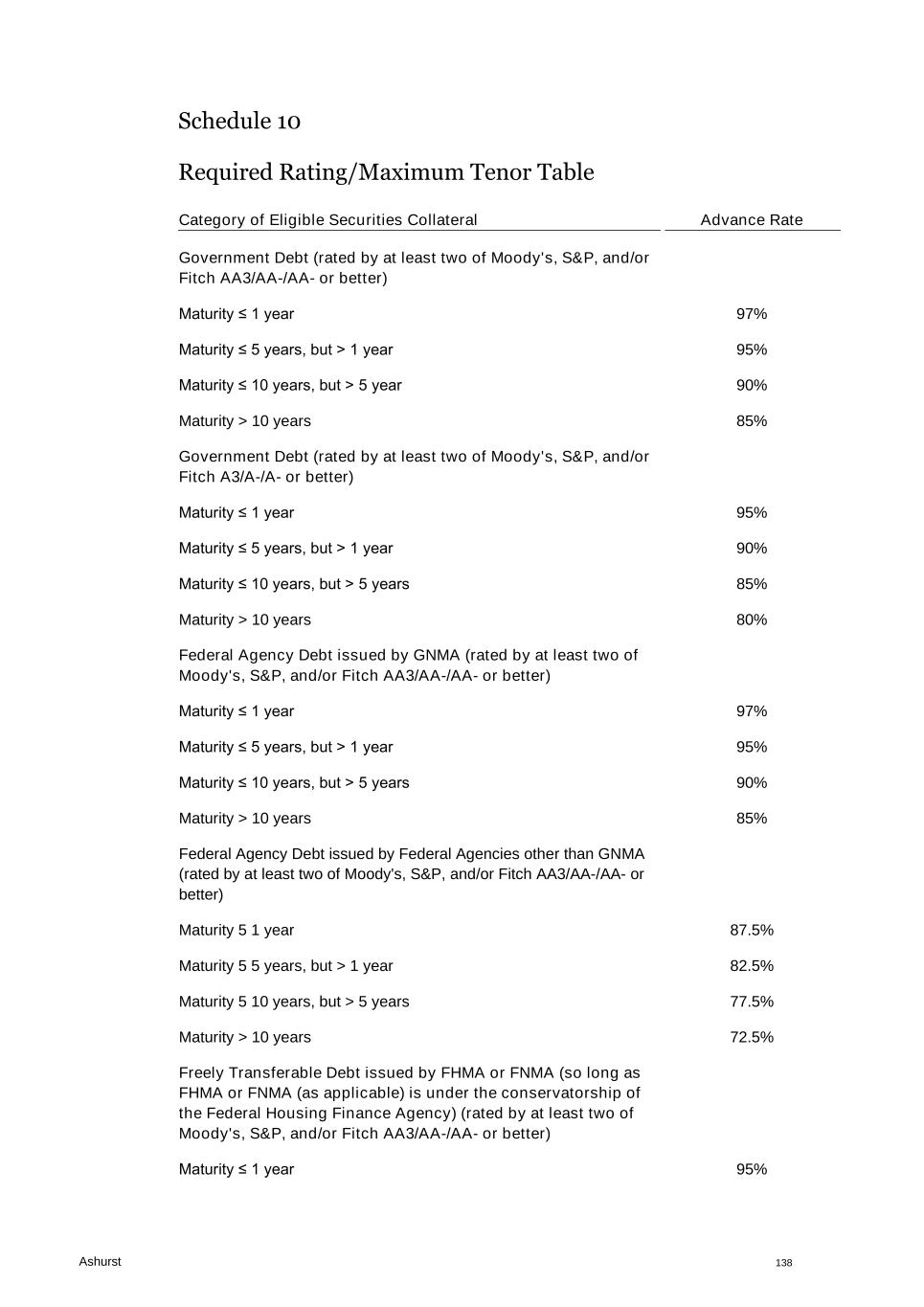 Ashurst 138 Schedule 10 Required Rating/Maximum Tenor Table Category of Eligible Securities Collateral Advance Rate Government Debt (rated by at least two of Moody's, S&P, and/or Fitch AA3/AA-/AA- or better) Maturity ≤ 1 year 97% Maturity ≤ 5 years, but > 1 year 95% Maturity ≤ 10 years, but > 5 year 90% Maturity > 10 years 85% Government Debt (rated by at least two of Moody's, S&P, and/or Fitch A3/A-/A- or better) Maturity ≤ 1 year 95% Maturity ≤ 5 years, but > 1 year 90% Maturity ≤ 10 years, but > 5 years 85% Maturity > 10 years 80% Federal Agency Debt issued by GNMA (rated by at least two of Moody's, S&P, and/or Fitch AA3/AA-/AA- or better) Maturity ≤ 1 year 97% Maturity ≤ 5 years, but > 1 year 95% Maturity ≤ 10 years, but > 5 years 90% Maturity > 10 years 85% Federal Agency Debt issued by Federal Agencies other than GNMA (rated by at least two of Moody's, S&P, and/or Fitch AA3/AA-/AA- or better) Maturity 5 1 year 87.5% Maturity 5 5 years, but > 1 year 82.5% Maturity 5 10 years, but > 5 years 77.5% Maturity > 10 years 72.5% Freely Transferable Debt issued by FHMA or FNMA (so long as FHMA or FNMA (as applicable) is under the conservatorship of the Federal Housing Finance Agency) (rated by at least two of Moody's, S&P, and/or Fitch AA3/AA-/AA- or better) Maturity ≤ 1 year 95%