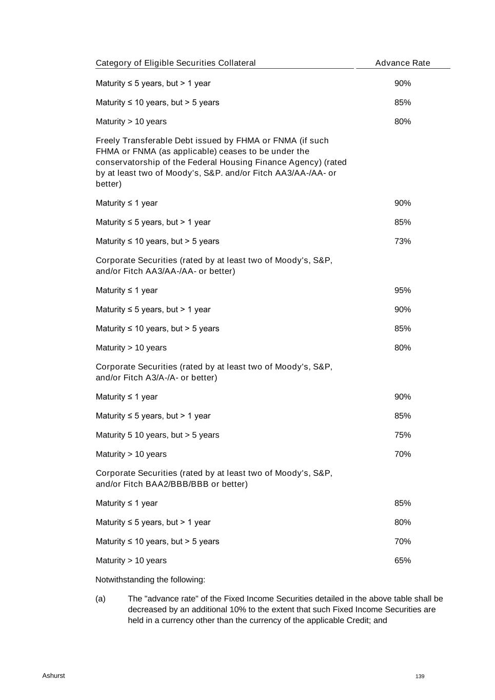 Ashurst 139 Category of Eligible Securities Collateral Advance Rate Maturity ≤ 5 years, but > 1 year 90% Maturity ≤ 10 years, but > 5 years 85% Maturity > 10 years 80% Freely Transferable Debt issued by FHMA or FNMA (if such FHMA or FNMA (as applicable) ceases to be under the conservatorship of the Federal Housing Finance Agency) (rated by at least two of Moody's, S&P. and/or Fitch AA3/AA-/AA- or better) Maturity ≤ 1 year 90% Maturity ≤ 5 years, but > 1 year 85% Maturity ≤ 10 years, but > 5 years 73% Corporate Securities (rated by at least two of Moody's, S&P, and/or Fitch AA3/AA-/AA- or better) Maturity ≤ 1 year 95% Maturity ≤ 5 years, but > 1 year 90% Maturity ≤ 10 years, but > 5 years 85% Maturity > 10 years 80% Corporate Securities (rated by at least two of Moody's, S&P, and/or Fitch A3/A-/A- or better) Maturity ≤ 1 year 90% Maturity ≤ 5 years, but > 1 year 85% Maturity 5 10 years, but > 5 years 75% Maturity > 10 years 70% Corporate Securities (rated by at least two of Moody's, S&P, and/or Fitch BAA2/BBB/BBB or better) Maturity ≤ 1 year 85% Maturity ≤ 5 years, but > 1 year 80% Maturity ≤ 10 years, but > 5 years 70% Maturity > 10 years 65% Notwithstanding the following: (a) The "advance rate" of the Fixed Income Securities detailed in the above table shall be decreased by an additional 10% to the extent that such Fixed Income Securities are held in a currency other than the currency of the applicable Credit; and