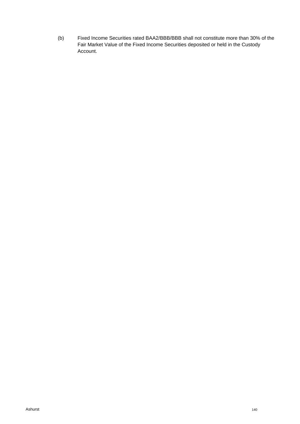 Ashurst 140 (b) Fixed Income Securities rated BAA2/BBB/BBB shall not constitute more than 30% of the Fair Market Value of the Fixed Income Securities deposited or held in the Custody Account.