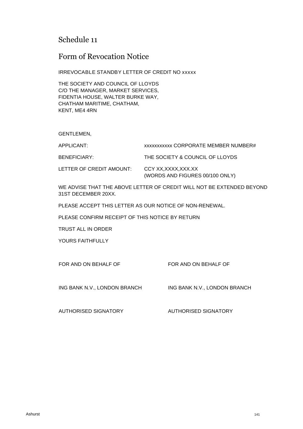 Ashurst 141 Schedule 11 Form of Revocation Notice IRREVOCABLE STANDBY LETTER OF CREDIT NO xxxxx THE SOCIETY AND COUNCIL OF LLOYDS C/O THE MANAGER, MARKET SERVICES, FIDENTIA HOUSE, WALTER BURKE WAY, CHATHAM MARITIME, CHATHAM, KENT, ME4 4RN GENTLEMEN, APPLICANT: xxxxxxxxxxx CORPORATE MEMBER NUMBER# BENEFICIARY: THE SOCIETY & COUNCIL OF LLOYDS LETTER OF CREDIT AMOUNT: CCY XX,XXXX,XXX.XX (WORDS AND FIGURES 00/100 ONLY) WE ADVISE THAT THE ABOVE LETTER OF CREDIT WILL NOT BE EXTENDED BEYOND 31ST DECEMBER 20XX. PLEASE ACCEPT THIS LETTER AS OUR NOTICE OF NON-RENEWAL. PLEASE CONFIRM RECEIPT OF THIS NOTICE BY RETURN TRUST ALL IN ORDER YOURS FAITHFULLY FOR AND ON BEHALF OF FOR AND ON BEHALF OF ING BANK N.V., LONDON BRANCH ING BANK N.V., LONDON BRANCH AUTHORISED SIGNATORY AUTHORISED SIGNATORY