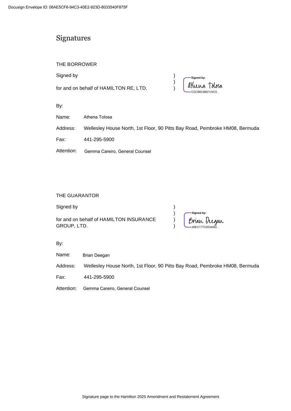 Signature page to the Hamilton 2025 Amendment and Restatement Agreement Signatures THE BORROWER Signed by for and on behalf of HAMILTON RE, LTD. ) ) ) By: Name: Address: Wellesley House North, 1st Floor, 90 Pitts Bay Road, Pembroke HM08, Bermuda Fax: 441-295-5900 Attention: THE GUARANTOR Signed by for and on behalf of HAMILTON INSURANCE GROUP, LTD. ) ) ) ) By: Name: Address: Wellesley House North, 1st Floor, 90 Pitts Bay Road, Pembroke HM08, Bermuda Fax: 441-295-5900 Attention: Docusign Envelope ID: 06AE5CF6-94C3-40E2-923D-8033540F875F Athena Tolosa Gemma Careiro, General Counsel Brian Deegan Gemma Careiro, General Counsel