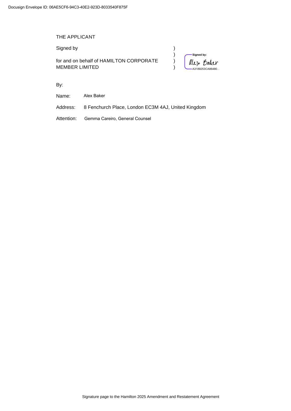 Signature page to the Hamilton 2025 Amendment and Restatement Agreement THE APPLICANT Signed by for and on behalf of HAMILTON CORPORATE MEMBER LIMITED ) ) ) ) By: Name: Address: 8 Fenchurch Place, London EC3M 4AJ, United Kingdom Attention: Docusign Envelope ID: 06AE5CF6-94C3-40E2-923D-8033540F875F Alex Baker Gemma Careiro, General Counsel