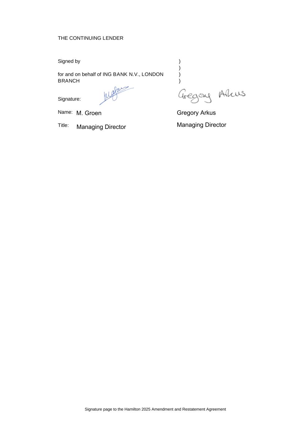 Signature page to the Hamilton 2025 Amendment and Restatement Agreement THE CONTINUING LENDER Signed by for and on behalf of ING BANK N.V., LONDON BRANCH ) ) ) ) Signature: Name: Title: M. Groen Managing Director Gregory Arkus Managing Director