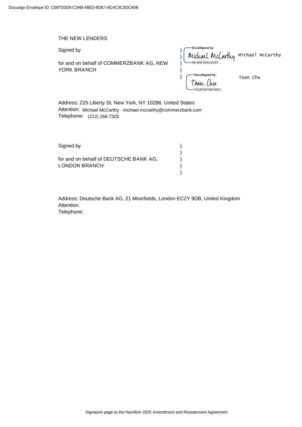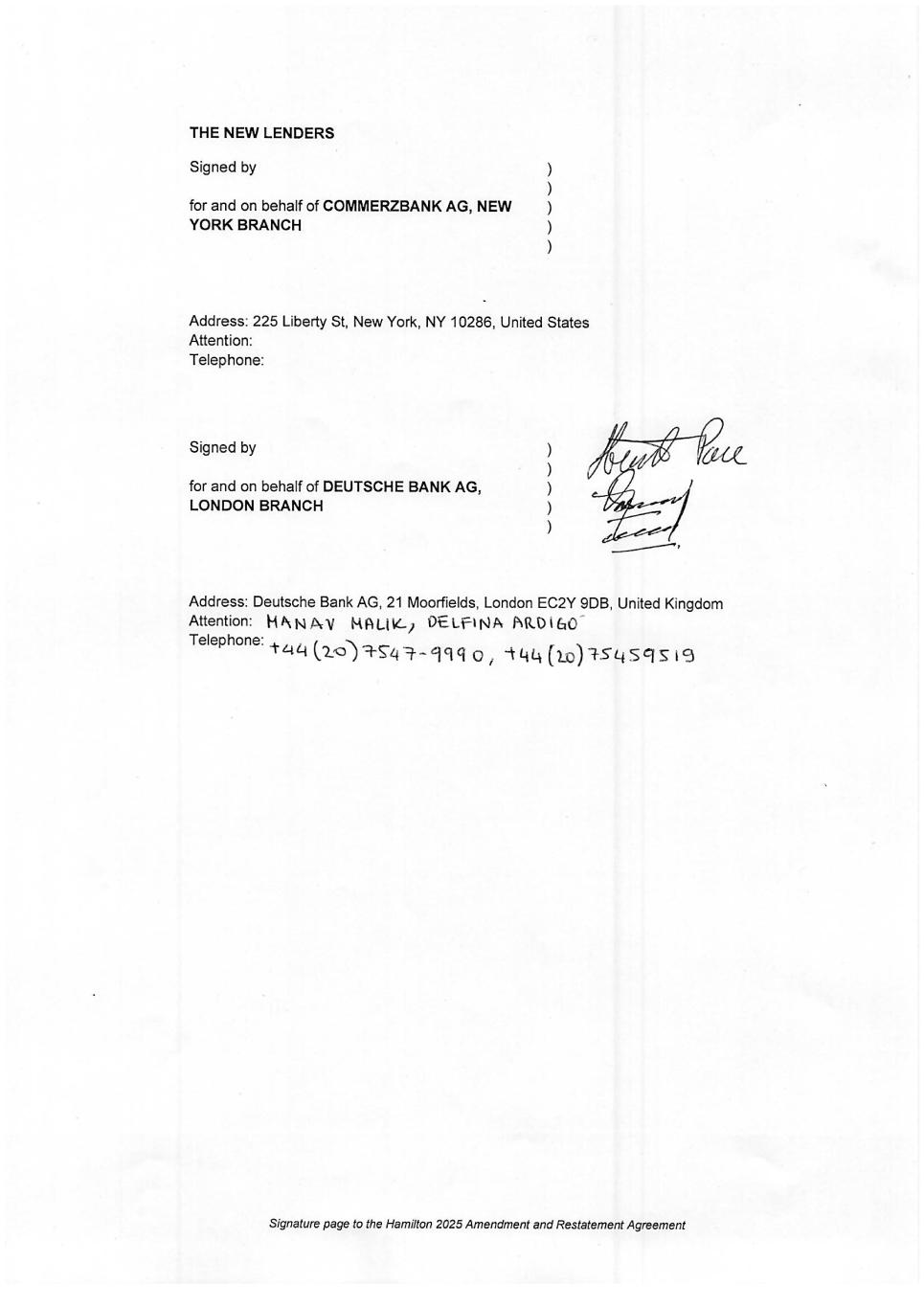 Signature page to the Hamilton 2025 Amendment and Restatement Agreement THE NEW LENDERS Signed by for and on behalf of COMMERZBANK AG, NEW YORK BRANCH ) ) ) ) ) Address: 225 Liberty St, New York, NY 10286, United States Attention: Telephone: Signed by for and on behalf of DEUTSCHE BANK AG, LONDON BRANCH ) ) ) ) ) Address: Deutsche Bank AG, 21 Moorfields, London EC2Y 9DB, United Kingdom Attention: Telephone: Docusign Envelope ID: C097D0D5-C3AB-48ED-8DE1-8C4C3C3DCA06 Michael McCarthy Toan Chu Michael McCarthy - michael.mccarthy@commerzbank.com (212) 266-7325