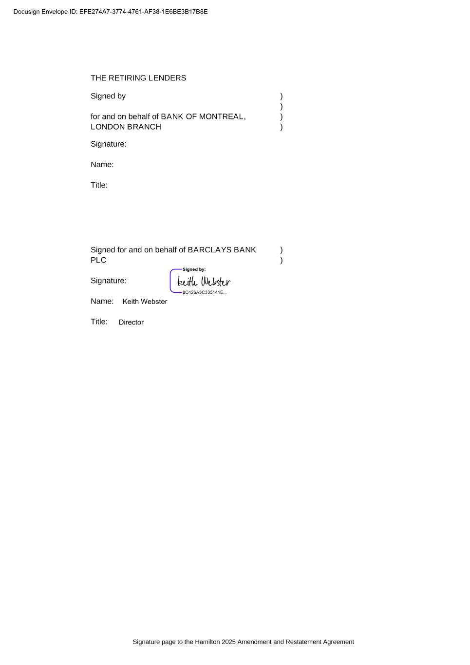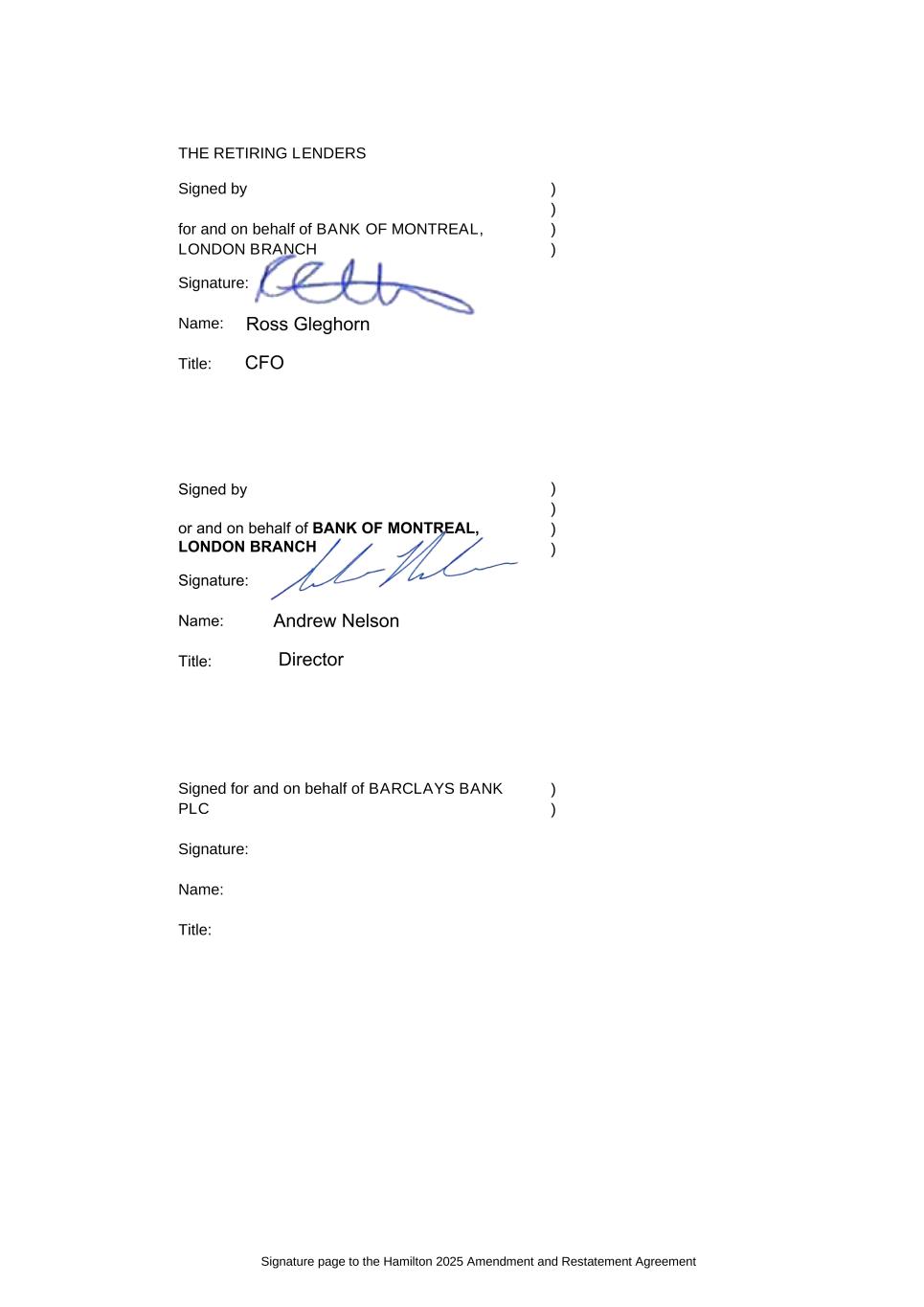 Signature page to the Hamilton 2025 Amendment and Restatement Agreement THE RETIRING LENDERS Signed by for and on behalf of BANK OF MONTREAL, LONDON BRANCH ) ) ) ) Signature: Name: Title: Signed for and on behalf of BARCLAYS BANK PLC Signature: Name: Title: ) ) Docusign Envelope ID: EFE274A7-3774-4761-AF38-1E6BE3B17B8E Keith Webster Director