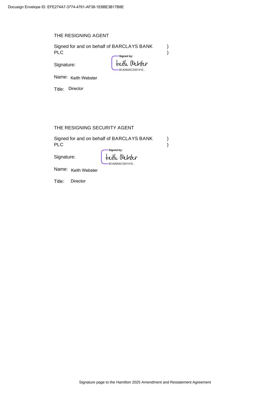 Signature page to the Hamilton 2025 Amendment and Restatement Agreement THE RESIGNING AGENT Signed for and on behalf of BARCLAYS BANK PLC Signature: Name: Title: ) ) THE RESIGNING SECURITY AGENT Signed for and on behalf of BARCLAYS BANK PLC Signature: Name: Title: ) ) Docusign Envelope ID: EFE274A7-3774-4761-AF38-1E6BE3B17B8E Director Director Keith Webster Keith Webster