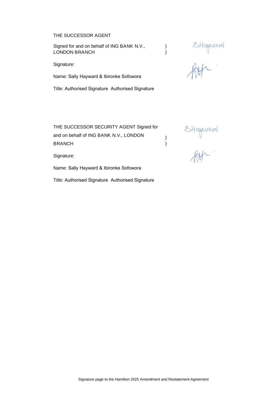 Signature page to the Hamilton 2025 Amendment and Restatement Agreement ) ) THE SUCCESSOR AGENT Signed for and on behalf of ING BANK N.V., LONDON BRANCH Signature: Name: Sally Hayward & Ibironke Sofowora Title: Authorised Signature Authorised Signature THE SUCCESSOR SECURITY AGENT Signed for and on behalf of ING BANK N.V., LONDON BRANCH Signature: Name: Sally Hayward & Ibironke Sofowora Title: Authorised Signature Authorised Signature ) )