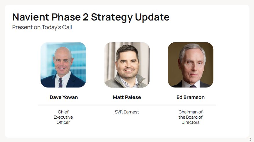 Ma Palese  Ed Bramson  Dave Yowan  Navient Phase 2 Strategy Update  Present on Today’s Call  Chief Executive Oicer  SVP, Earnest  Chairman of the Board of Directors  2
