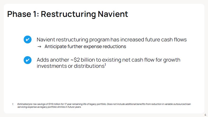 Phase 1: Restructuring Navient  Navient restructuring program has increased future cash flows  → Anticipate further expense reductions  1. Estimated pre-tax savings of $119 million for 17 year remaining life of legacy portfolio. Does not include additional benefits from reduction in variable outsourced loan servicing expense as legacy portfolio shrinks in future years.  ✔•  ✔• Adds another ~$2 billion to existing net cash flow for growth investments or distributions1  2