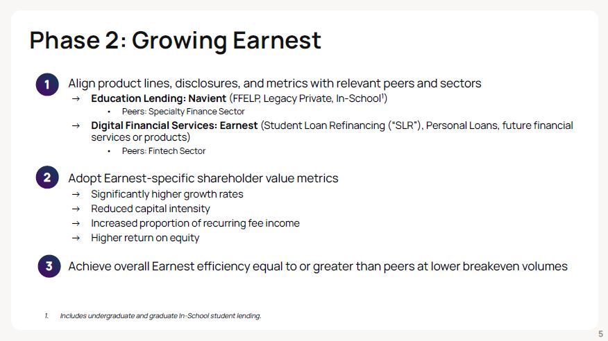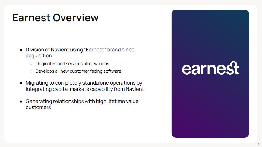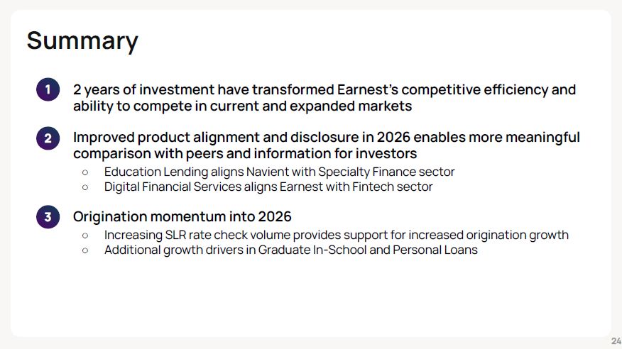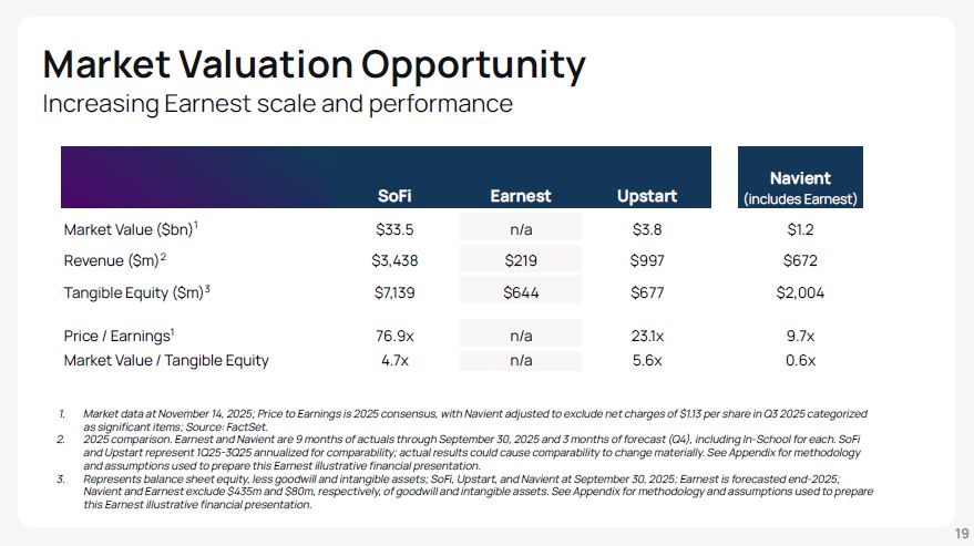 Market Valuation Opportunity  Increasing Earnest scale and performance  Market data at November 14, 2025; Price to Earnings is 2025 consensus, with Navient adjusted to exclude net charges of $1.13 per share in Q3 2025 categorized as significant items; Source: FactSet.  2025 comparison. Earnest and Navient are 9 months of actuals through September 30, 2025 and 3 months of forecast (Q4), including In-School for each. SoFi and Upstart represent 1Q25-3Q25 annualized for comparability; actual results could cause comparability to change materially. See Appendix for methodology and assumptions used to prepare this Earnest illustrative financial presentation.  Represents balance sheet equity, less goodwill and intangible assets; SoFi, Upstart, and Navient at September 30, 2025; Earnest is forecasted end-2025; Navient and Earnest exclude $435m and $80m, respectively, of goodwill and intangible assets. See Appendix for methodology and assumptions used to prepare this Earnest illustrative financial presentation.  SoFi Earnest Upstart  Navient  (includes Earnest)  Market Value ($bn)1  $33.5  n/a  $3.8  $1.2  Revenue ($m)2  $3,438  $219  $997  $672  Tangible Equity ($m)3  $7,139  $644  $677  $2,004  Price / Earnings1  76.9x  n/a  23.1x  9.7x  Market Value / Tangible Equity  4.7x  n/a  5.6x  0.6x  17