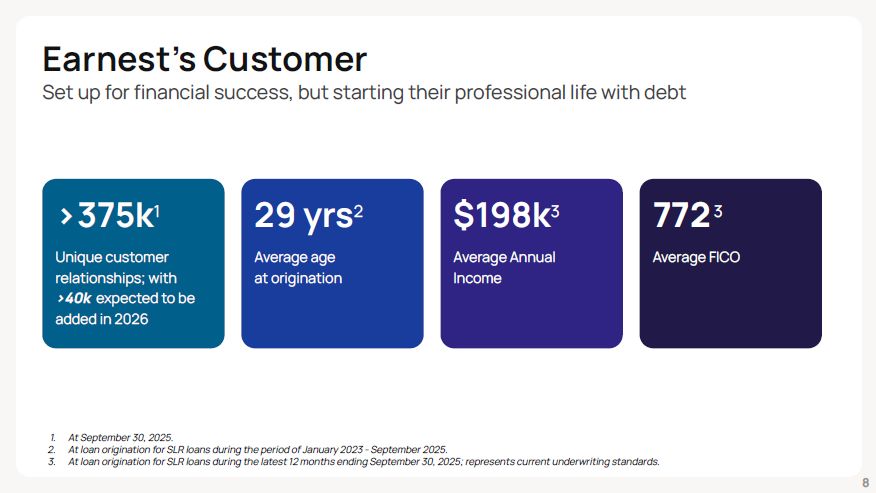 >375k1  Unique customer relationships; with  >40k expected to be added in 2026  29 yrs2  Average age at origination  $198k3  Average Annual Income  7723  Average FICO  2  Earnest’s Customer  Set up for financial success, but starting their professional life with debt  At September 30, 2025.  At loan origination for SLR loans during the period of January 2023 - September 2025.  At loan origination for SLR loans during the latest 12 months ending September 30, 2025; represents current underwriting standards.
