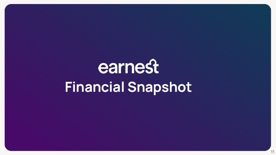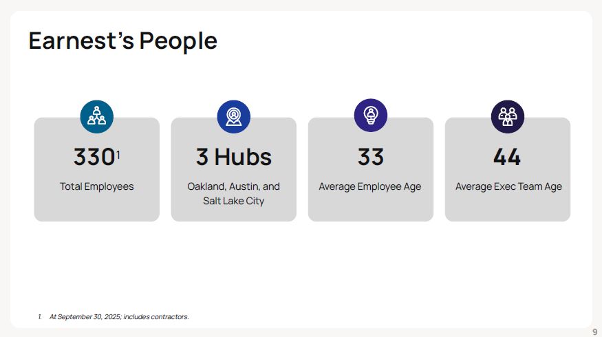 Earnest’s People  10  3301  Total Employees  3 Hubs  Oakland, Austin, and Salt Lake City  33  Average Employee Age  44  Average Exec Team Age  1. At September 30, 2025; includes contractors.