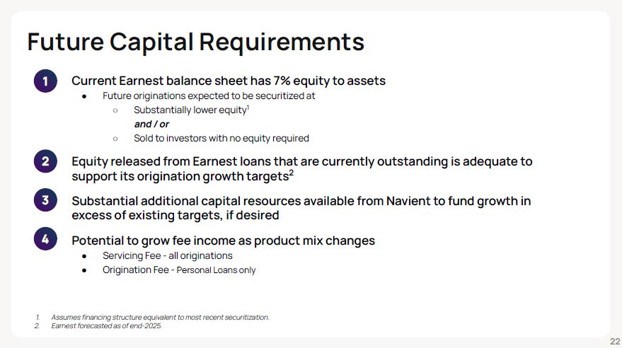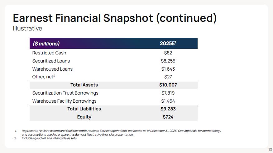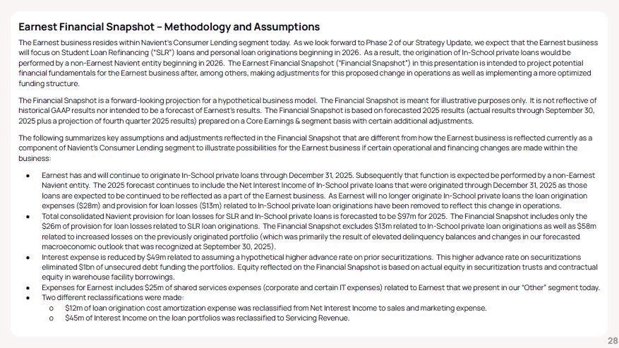 Earnest Financial Snapshot – Methodology and Assumptions  26  The Earnest business resides within Navient’s Consumer Lending segment today. As we look forward to Phase 2 of our Strategy Update, we expect that the Earnest business will focus on Student Loan Refinancing (“SLR”) loans and personal loan originations beginning in 2026. As a result, the origination of In-School private loans would be performed by a non-Earnest Navient entity beginning in 2026. The Earnest Financial Snapshot (“Financial Snapshot”) in this presentation is intended to project potential financial fundamentals for the Earnest business after, among others, making adjustments for this proposed change in operations as well as implementing a more optimized funding structure.  The Financial Snapshot is a forward-looking projection for a hypothetical business model. The Financial Snapshot is meant for illustrative purposes only. It is not reflective of historical GAAP results nor intended to be a forecast of Earnest’s results. The Financial Snapshot is based on forecasted 2025 results (actual results through September 30, 2025 plus a projection of fourth quarter 2025 results) prepared on a Core Earnings & segment basis with certain additional adjustments.  The following summarizes key assumptions and adjustments reflected in the Financial Snapshot that are dierent from how the Earnest business is reflected currently as a component of Navient’s Consumer Lending segment to illustrate possibilities for the Earnest business if certain operational and financing changes are made within the business:  Earnest has and will continue to originate In-School private loans through December 31, 2025. Subsequently that function is expected be performed by a non-Earnest Navient entity. The 2025 forecast continues to include the Net Interest Income of In-School private loans that were originated through December 31, 2025 as those loans are expected to be continued to be reflected as a part of the Earnest business. As Earnest will no longer originate In-School private loans the loan origination expenses ($28m) and provision for loan losses ($13m) related to In-School private loan originations have been removed to reflect this change in operations.  Total consolidated Navient provision for loan losses for SLR and In-School private loans is forecasted to be $97m for 2025. The Financial Snapshot includes only the  $26m of provision for loan losses related to SLR loan originations. The Financial Snapshot excludes $13m related to In-School private loan originations as well as $58m related to increased losses on the previously originated portfolio (which was primarily the result of elevated delinquency balances and changes in our forecasted macroeconomic outlook that was recognized at September 30, 2025).  Interest expense is reduced by $49m related to assuming a hypothetical higher advance rate on prior securitizations. This higher advance rate on securitizations eliminated $1bn of unsecured debt funding the portfolios. Equity reflected on the Financial Snapshot is based on actual equity in securitization trusts and contractual equity in warehouse facility borrowings.  Expenses for Earnest includes $25m of shared services expenses (corporate and certain IT expenses) related to Earnest that we present in our “Other” segment today.  Two dierent reclassifications were made:  $12m of loan origination cost amortization expense was reclassified from Net Interest Income to sales and marketing expense.  $45m of Interest Income on the loan portfolios was reclassified to Servicing Revenue.