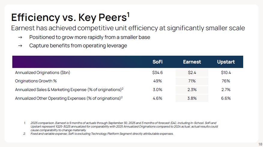 Eiciency vs. Key Peers1  Earnest has achieved competitive unit eiciency at significantly smaller scale  → Positioned to grow more rapidly from a smaller base  → Capture benefits from operating leverage  2025 comparison. Earnest is 9 months of actuals through September 30, 2025 and 3 months of forecast (Q4), including In-School. SoFi and Upstart represent 1Q25-3Q25 annualized for comparability with 2025 Annualized Originations compared to 2024 actual; actual results could cause comparability to change materially.  Fixed and variable expense; SoFi is excluding Technology Platform Segment directly aributable expenses.  SoFi  Earnest  Upstart  Annualized Originations ($bn)  $34.6  $2.4  $10.4  Originations Growth %  49%  71%  76%  Annualized Sales & Marketing Expense (% of originations)2  3.0%  2.3%  2.7%  Annualized Other Operating Expenses (% of originations)2  4.6%  3.8%  6.6%  17