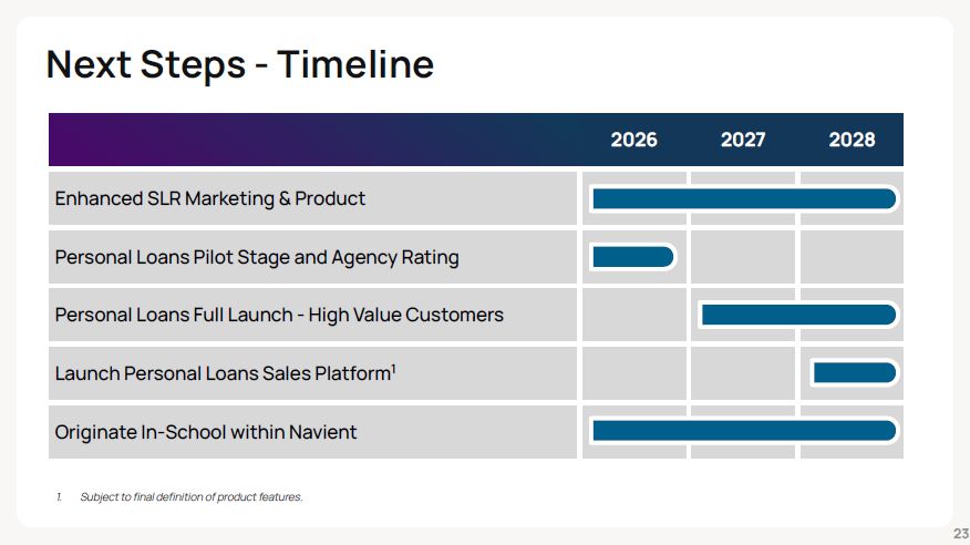 Next Steps - Timeline  2026  2027  2028  Enhanced SLR Marketing & Product  Personal Loans Pilot Stage and Agency Rating Personal Loans Full Launch - High Value Customers Launch Personal Loans Sales Platform1  Originate In-School within Navient  1. Subject to final definition of product features.  23