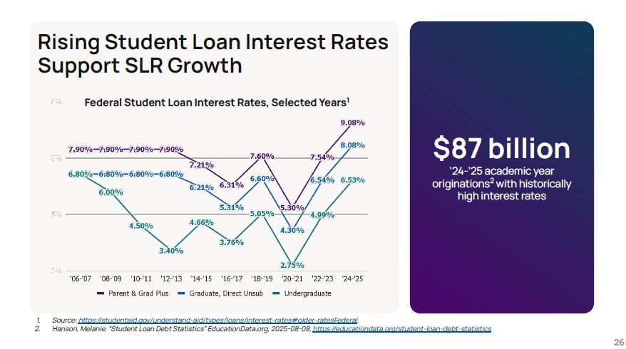 Rising Student Loan Interest Rates Support SLR Growth  Source: hps: /studentaid.gov/understand-aid/types/loans/interest-rates#older-ratesFederal.  Hanson, Melanie. “Student Loan Debt Statistics” EducationData.org, 2025-08-08, hps: /educationdata.org/student-loan-debt-statistics  $87 billion  ‘24-’25 academic year originations2 with historically high interest rates  Federal Student Loan Interest Rates, Selected Years1  26