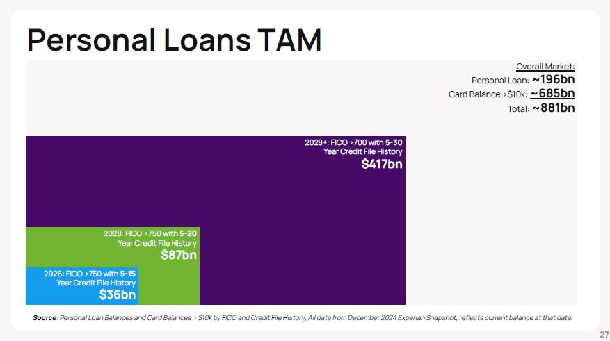 Personal Loans TAM  Source: Personal Loan Balances and Card Balances > $10k by FICO and Credit File History; All data from December 2024 Experian Snapshot; reflects current balance at that date.  2028+: FICO >700 with 5-30  Year Credit File History  $417bn  Overall Market: Personal Loan: ~196bn  Card Balance >$10k: ~685bn  Total: ~881bn  2028: FICO >750 with 5-20  Year Credit File History  $87bn  2026: FICO >750 with 5-15  Year Credit File History  $36bn  26